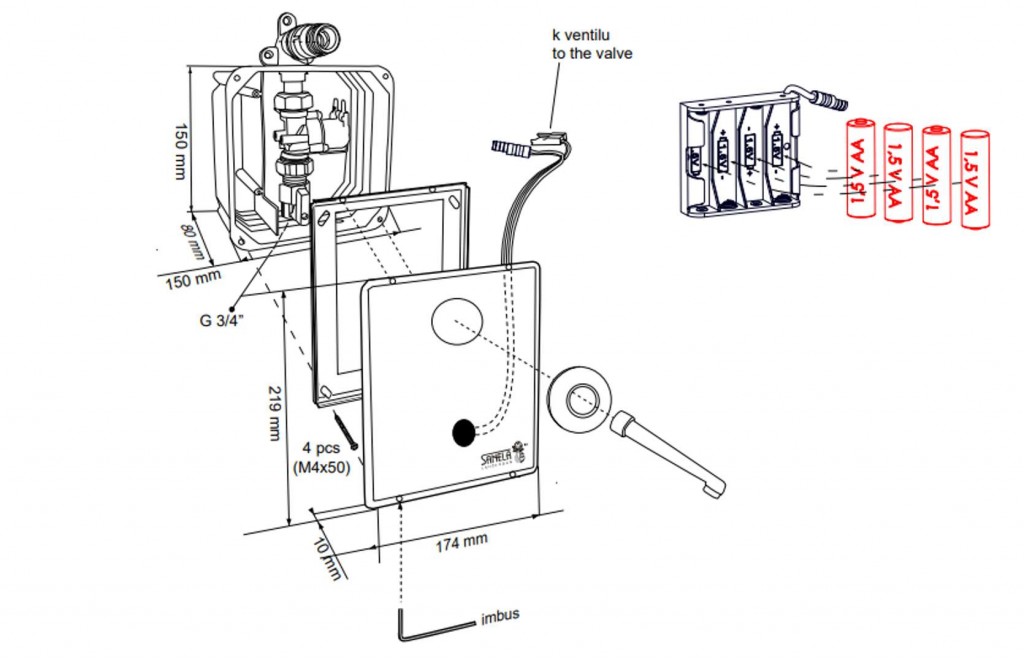 nerezový kryt s elektronikou a piezo snímačom, nerezová inštalačná krabica so zabudovaným elektromagnetickým ventilom a skrutkovaním, výtokové ramienko 170 mm, lítiová napájacej batérie SLA 09