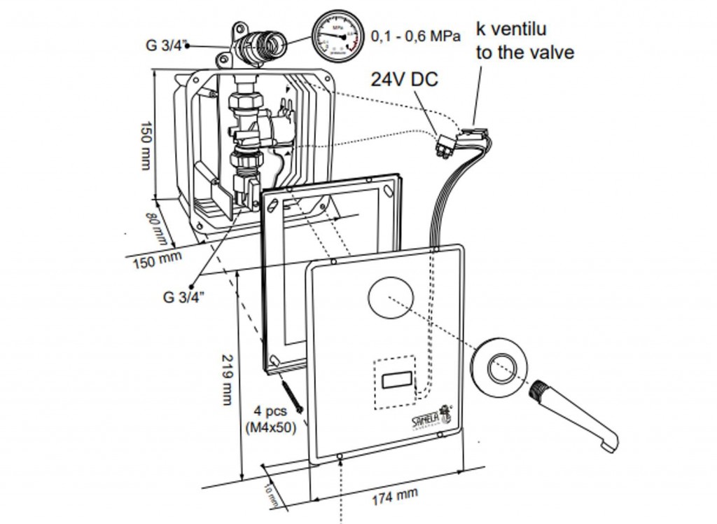 nerezový kryt s elektronikou, nerezová inštalačná krabica so zabudovaným elektromagnetickým ventilom a skrutkovaním, výtokové ramienko 170 mm