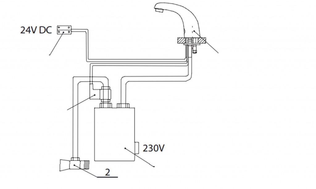 výtokové ramienko s integrovaným blokom elektroniky, elektromagnetický ventil (1 ks), prepojovacie hadice, rohový ventil so spätnou klapkou