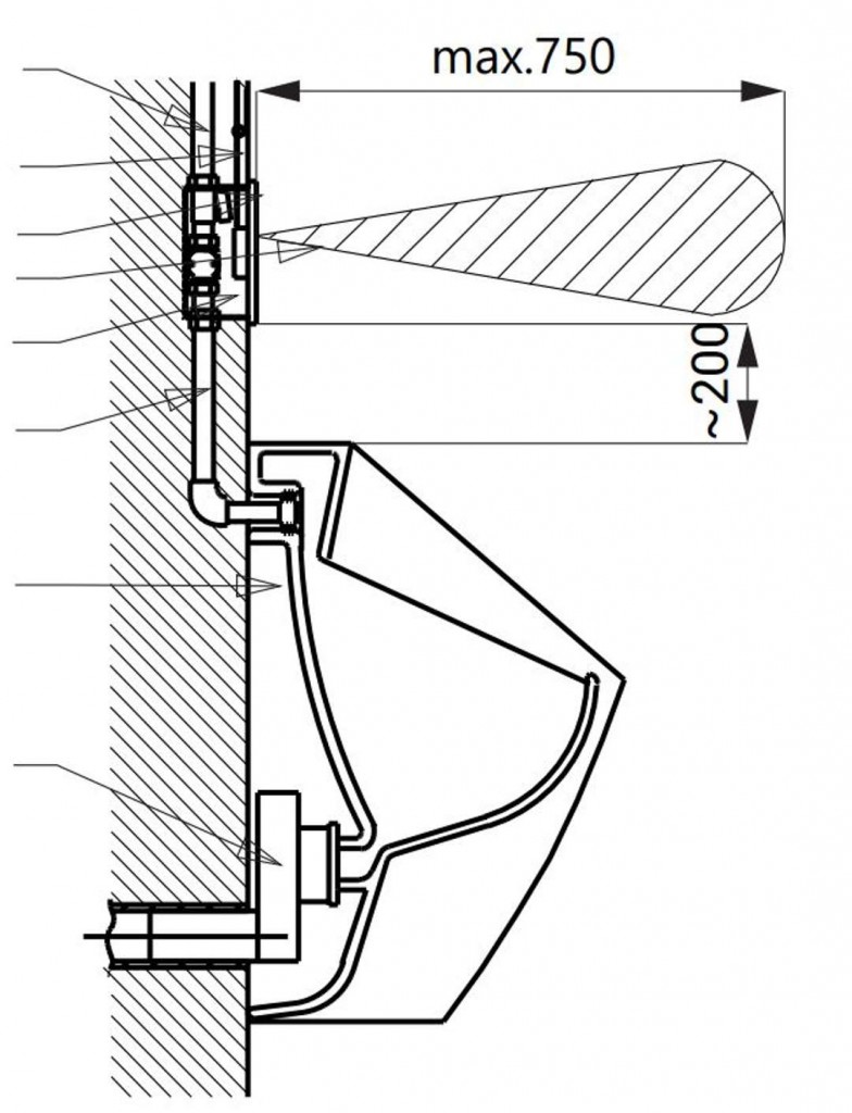 - reaguje na prítomnosť osoby pred pisoárom vo vzdialenosti max. 70 cm od snímača po dobu dlhšiu ako 7,5 s
