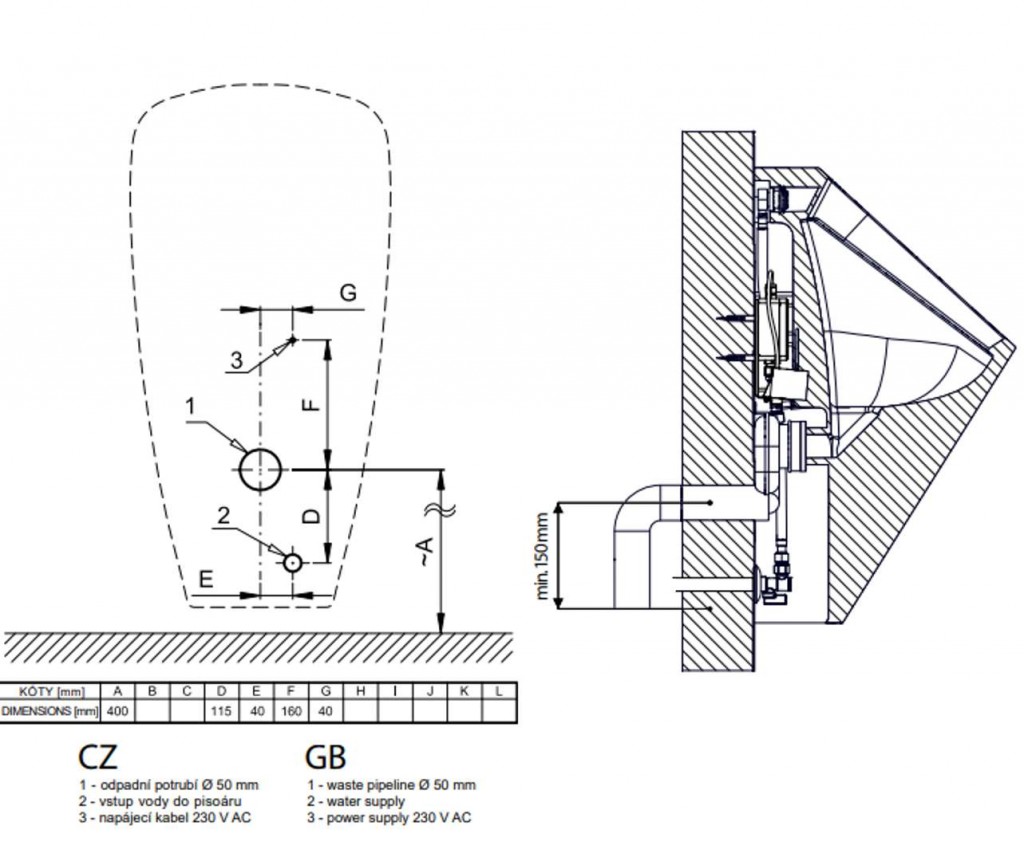 keramický pisoár, montážna lišta s radarovým splachovačom, elektromagnetický ventil, prepojovacie hadice, rohový ventil, špeciálna vtoková armatúra s tesnením, sifón, upevňovacia sada, montážna šablóna, integrovaný napájací zdroj