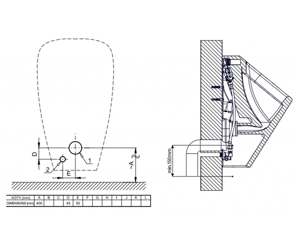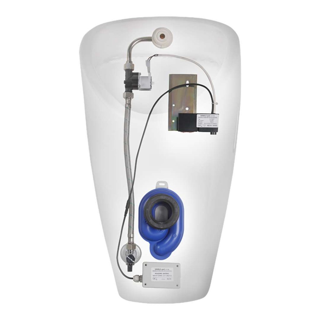 pisoár s integrovanou radarovou elektronikou pre batériové napájanie, elektromagnetický ventil, prepojovacie hadice, rohový ventil, špeciálna výtoková aramtura s tesnením, sifón, upevňovacia sada (4 ks AA alkalické, 1.5V, 2700 mAh), púzdro na batérie, napájacie batérie