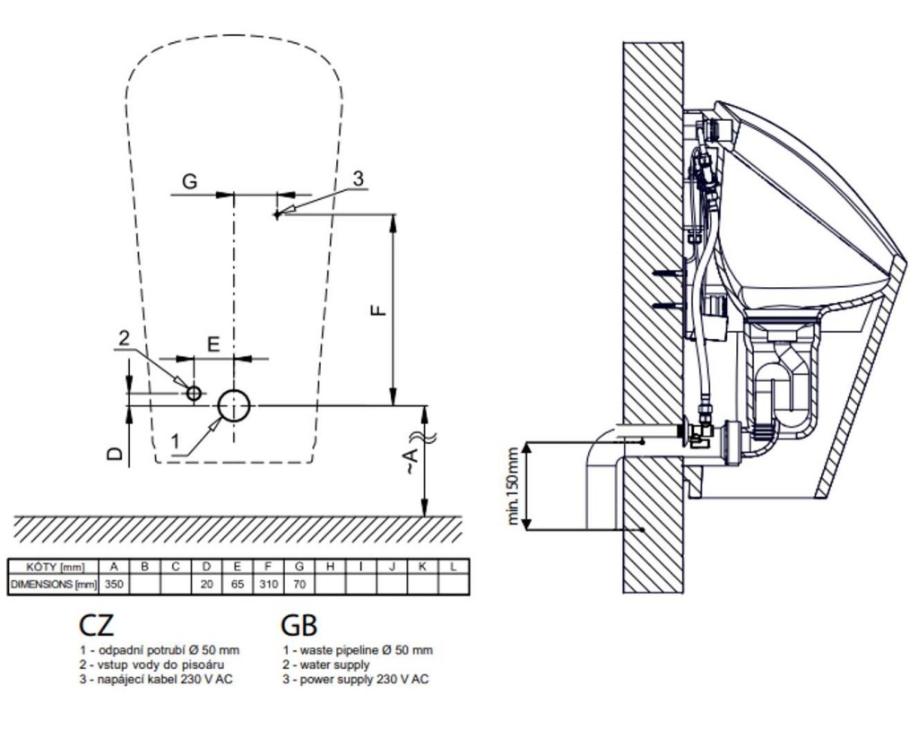 keramický pisoár s integrovanou radarovou elektronikou, montážna plastová krabica so skrutkovaním, elektromagnetickým ventilom a guľovým ventilom, výtoková armatúra s tesnením, sifón, upevňovacia sada, integrovaný napájací zdroj