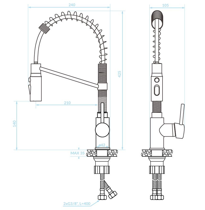Vďaka pružinovému flexibilnému výtoku získate plnú kontrolu nad prúdom vody a úplnú voľnosť pohybu. Oplachovanie, plnenie vysokých nádob alebo umývanie veľkého riadu sa tak stáva jednoduchšie, rýchlejšie a pohodlnejšie.