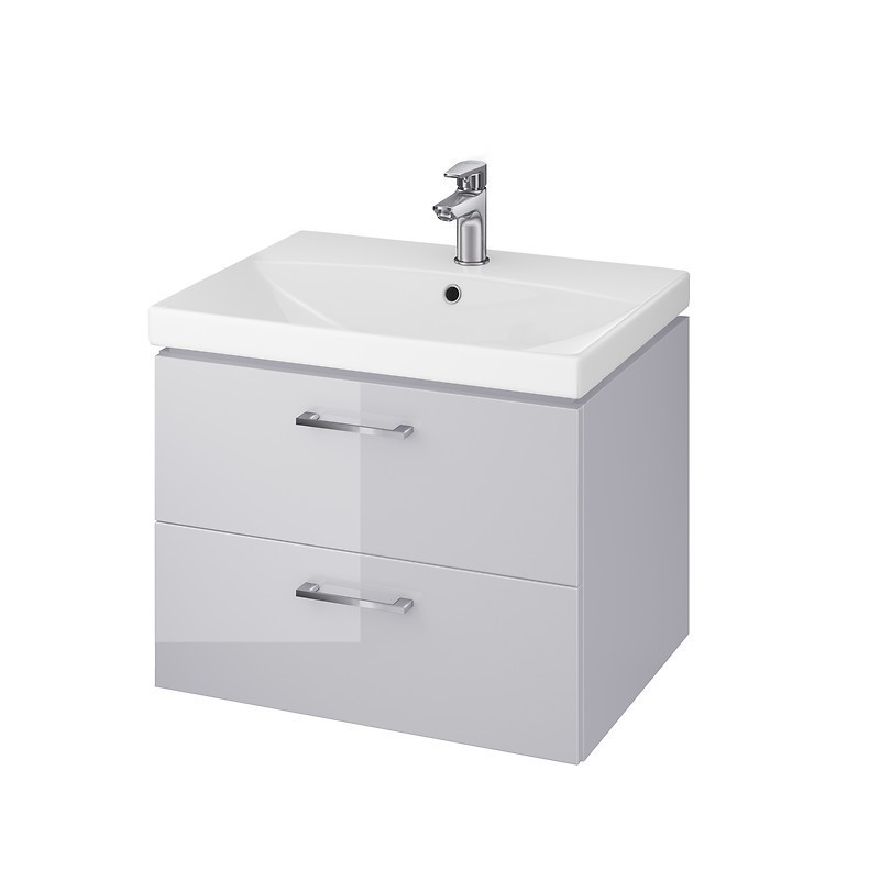 Závesná skrinka LARA v šedom lesklom prevedení s dvoma šuplíkmi, so systémom mäkkého dovieranie, je doplnená chrómovými madlami. Skrinka je dodávaná vrátane keramického umývadla CITY s otvorom pre batériu a prepadom.