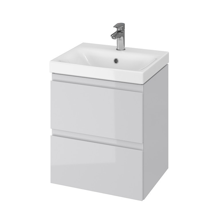 Závesná skrinka MODUO s umývadlom je príkladom moderného kúpeľňového nábytku. Predné časti zásuviek so skrytými úchytkami a telo skrinky je pokryté lesklým šedým lakom, umývadlo je s prepadom a otvorom pre batériu. Zásuvky sú vybavené tichým zatváracím systémom.