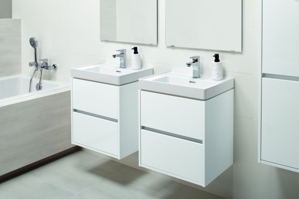 Súčasťou zostavy je závesná umývadlová skrinka CREA 80 s nábytkovým umývadlom CREA 80 . Čelo a korpus skrinky sú vyrobené z bielej drevotrieskovej dosky odolnej proti vlhkosti. Skrinka je vybavená systémom dotykového otvárania (tzv. PUSH SYSTEM) a dvoma priestrannými zásuvkami. Šedá štruktúra ľanu dodáva skrini ďalší elegantný vzhľad. Umývadlo CREA je vyrobené z keramickej hmoty ROCKLITE , vďaka čomu je prekvapivo odolné, ľahké as extrémne tenkými stenami. Nábytkové umývadlo CREA 80 je s prepadom a otvorom na armatúru.