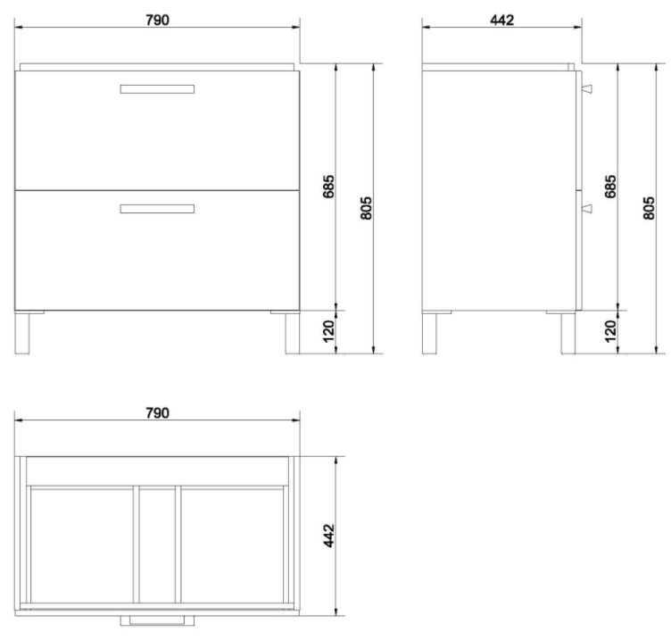 Jednoduchý dizajn a odolný materiál umývadlovej skrinky MELAR umožňujú pohodlné a ľahké čistenie. Skrinka je dodávaná s dvoma šuplíkmi so systémom tichého zatvárania a praktickými a elegantnými chrómovými madlami. Túto skrinku je možné namontovať na stenu alebo postaviť na podlahu, pokiaľ použijete nábytkové nožičky, ktoré nie sú súčasťou zostavy.