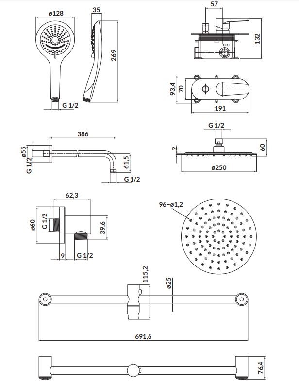 Sada MODUO obsahuje: podomietkovú vaňovú/ sprchovú batériu, sprchové rameno (mosadz), 3funkčnú ABS ručnú sprchu - Ø 13,8 cm, sprchovú hadicu z PVC (schválené WRAS), 150 cm dlhá s funkciou proti pretočeniu, dažďová sprcha SLIM priemer 25 cm , tyč 70 cm s posuvnou rukoväťou (nerez), mosadzná hranatá spojka.