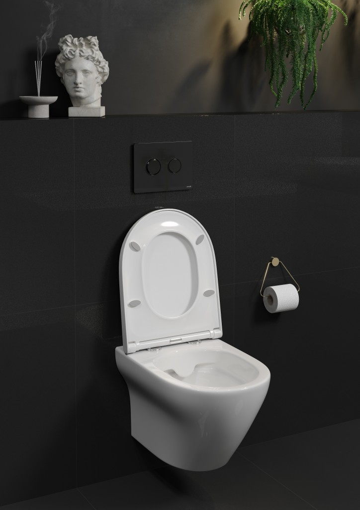 Sedátko LARGA OVAL SLIM WRAP z odolného duroplastu, odolného proti poškodeniu s antibakteriálnymi vlastnosťami a funkciou voľného pádu /SOFT CLOSE/. One Button Easy-Off umožňuje rýchle a jednoduché sňatie dosky jedným tlačidlom.