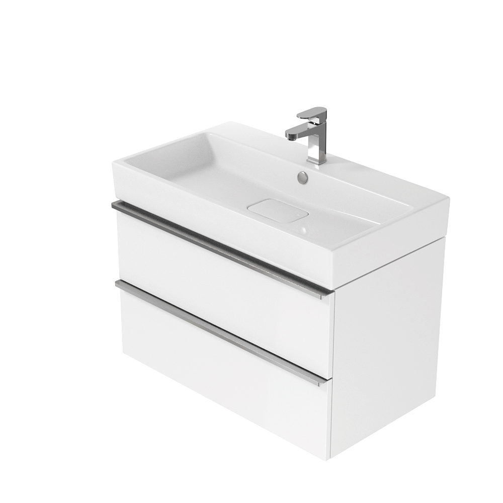 Závesná elegantná umývadlová skrinka VIRGO vyrobená z bielej lakovanej drevotrieskovej dosky s lesklým povrchom. Dve praktické zásuvky sú vybavené systémom „ soft-close “. Vnútri hornej zásuvky je výrez pre sifón s krytom a spodné časti zásuviek sú pokryté jemnou šedou ľanovou štruktúrou.