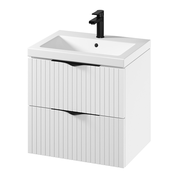 Predstavujeme vám závesnú umývadlovú skrinku TIRSO s keramickým, nábytkovým umývadlom COMO 60 . Skrinka je vyrobená z 16 mm drevotrieskovej dosky, je vybavená dvoma priestrannými zásuvkami so systémom tichého dovierania. Predné čelá šuplíkov sú frézované a doplniť skrinku môžete oceľovými úchytkami, ktoré sú dodávané vo farebnom prevedení chróm a čierna mat . Keramické umývadlo má otvor pre batériu a bezpečnostný prepad.