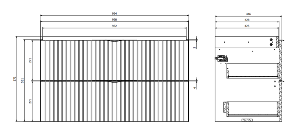 Predstavujeme vám závesnú umývadlovú skrinku TIRSO s keramickým, nábytkovým umývadlom COMO 100 . Skrinka je vyrobená z 16 mm drevotrieskovej dosky, je vybavená dvoma priestrannými zásuvkami so systémom tichého dovierania. Predné čelá šuplíkov sú frézované a doplniť skrinku môžete oceľovými úchytkami, ktoré sú dodávané vo farebnom prevedení chróm a čierna mat . Keramické umývadlo má otvor pre batériu a bezpečnostný prepad.