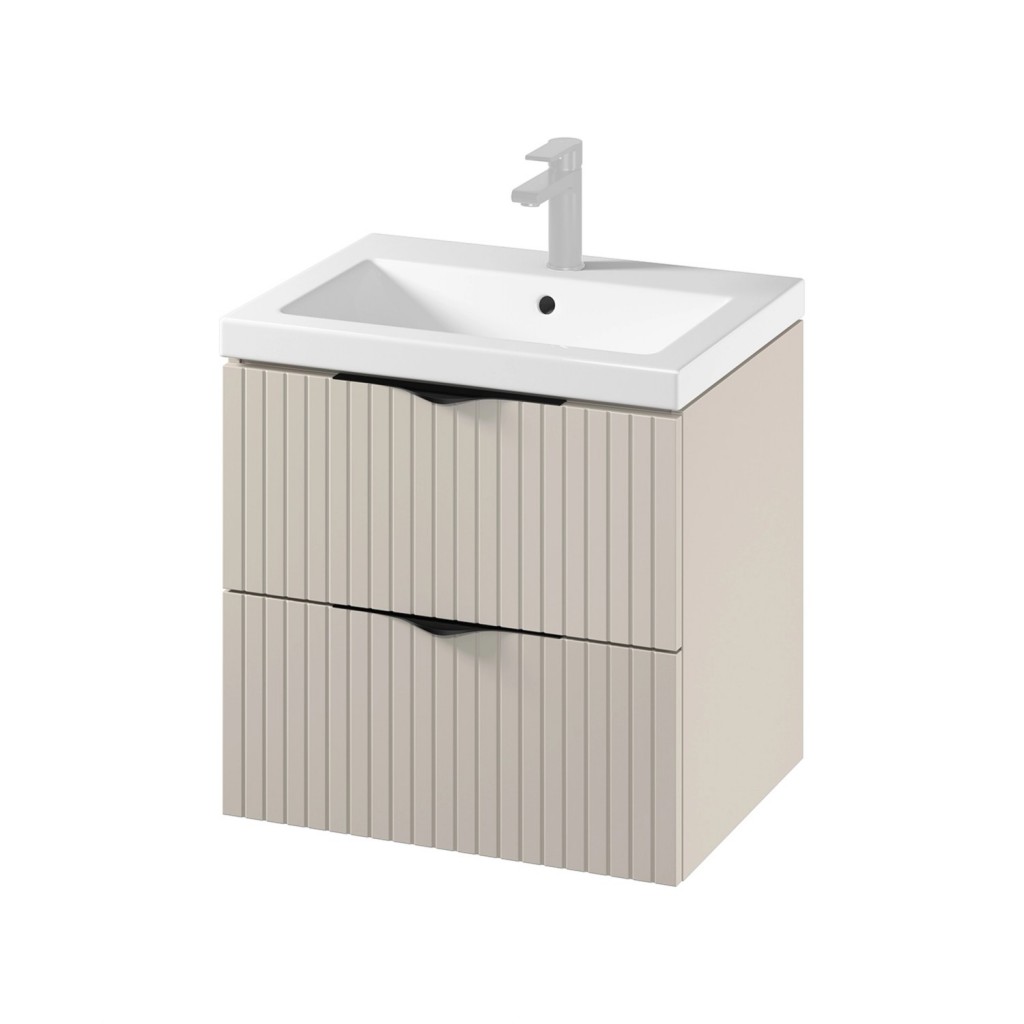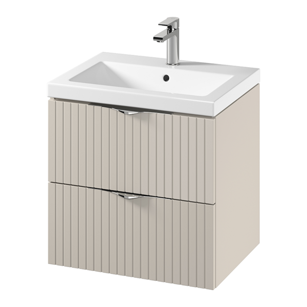 Predstavujeme vám závesnú umývadlovú skrinku TIRSO s keramickým, nábytkovým umývadlom COMO 60 . Skrinka je vyrobená z 16 mm drevotrieskovej dosky, je vybavená dvoma priestrannými zásuvkami so systémom tichého dovierania. Predné čelá šuplíkov sú frézované a doplniť skrinku môžete oceľovými úchytkami, ktoré sú dodávané vo farebnom prevedení chróm a čierna mat . Keramické umývadlo má otvor pre batériu a bezpečnostný prepad.