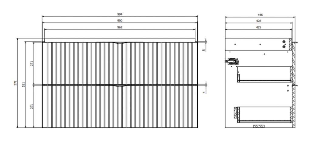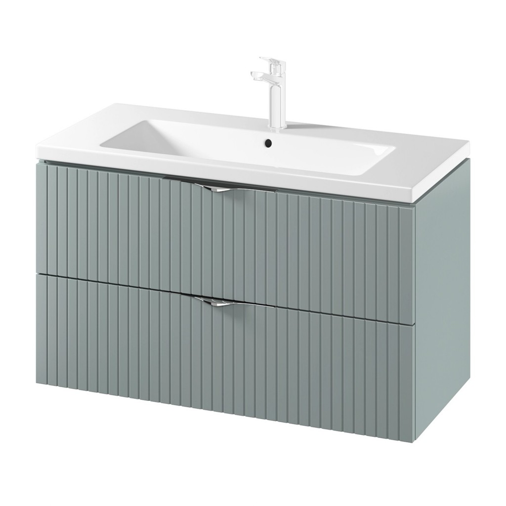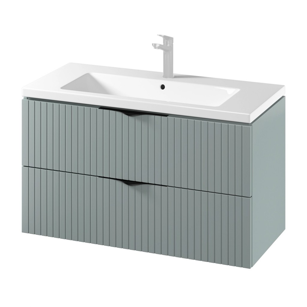 Predstavujeme vám závesnú umývadlovú skrinku TIRSO s keramickým, nábytkovým umývadlom COMO 100 . Skrinka je vyrobená z 16 mm drevotrieskovej dosky, je vybavená dvoma priestrannými zásuvkami so systémom tichého dovierania. Predné čelá šuplíkov sú frézované a doplniť skrinku môžete oceľovými úchytkami, ktoré sú dodávané vo farebnom prevedení chróm a čierna mat . Keramické umývadlo má otvor pre batériu a bezpečnostný prepad.