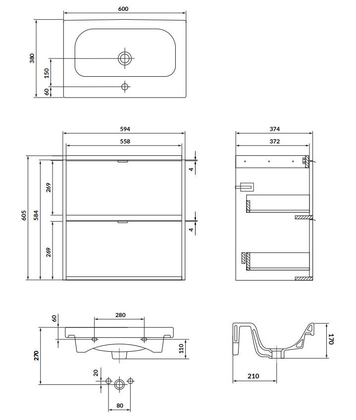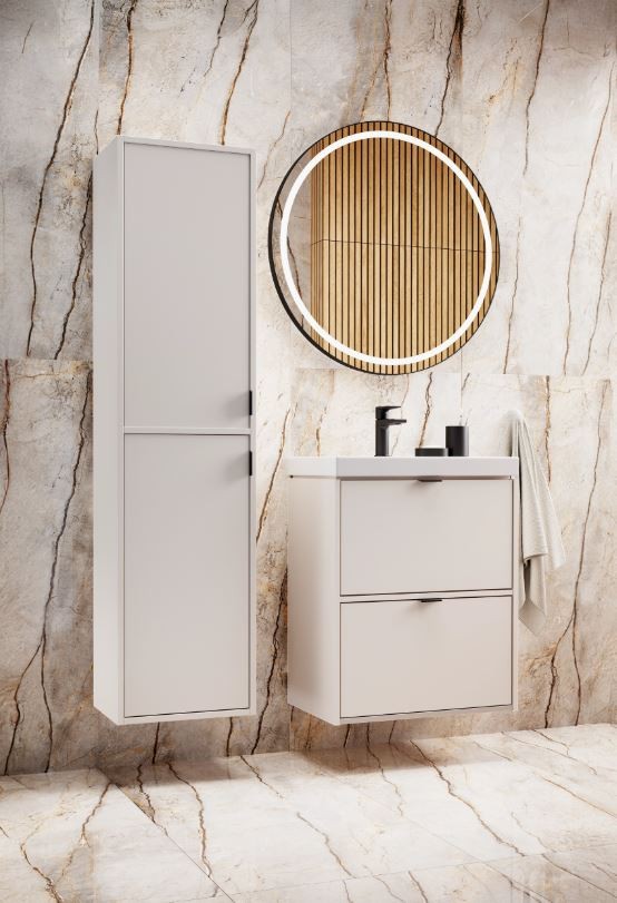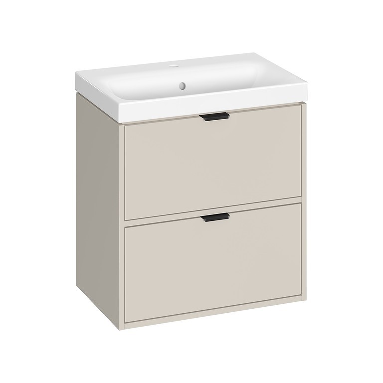 Skrinka s umývadlom ATRATO SLIM 60 v elegantnom odtieni kašmír dodá vašej kúpeľni moderný a sofistikovaný vzhľad. Vďaka závesnému prevedeniu pôsobí vzdušne a zároveň uľahčuje upratovanie podlahy. Vyrobená je z kvalitnej laminovanej drevotriesky s hrúbkou 16 mm, ktorá zaisťuje odolnosť voči vlhkosti a každodennému používaniu. Dve priestranné zásuvky s plným dnom poskytujú praktický úložný priestor na kozmetiku či čistiace prostriedky.