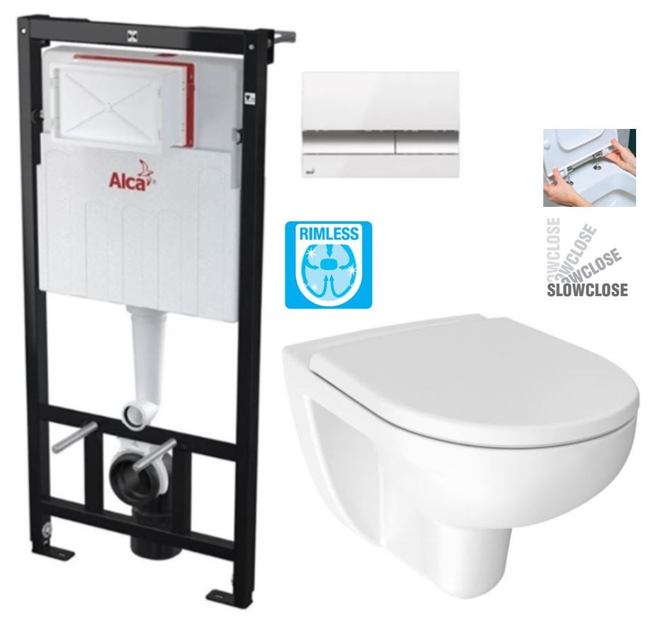 WC kombi RIMLESS / bez splachovacieho kruhu / = je moderný systém splachovania, ktorý sa charakterizuje znamenitou funkčnosťou a vysokou hygienou oproti bežným klozetům so splachovacím kruhom. U bežných klozetov môže dochádzať k zachytávanie nečistôt vo splachovacím kruhu pod okrajom misy. Súčasný systém zaisťuje dokonalý rozvod vody a jednoduché čistenie - všetok priestor vo vnútri misy je smaltovaný a jednoducho čistiteľný.