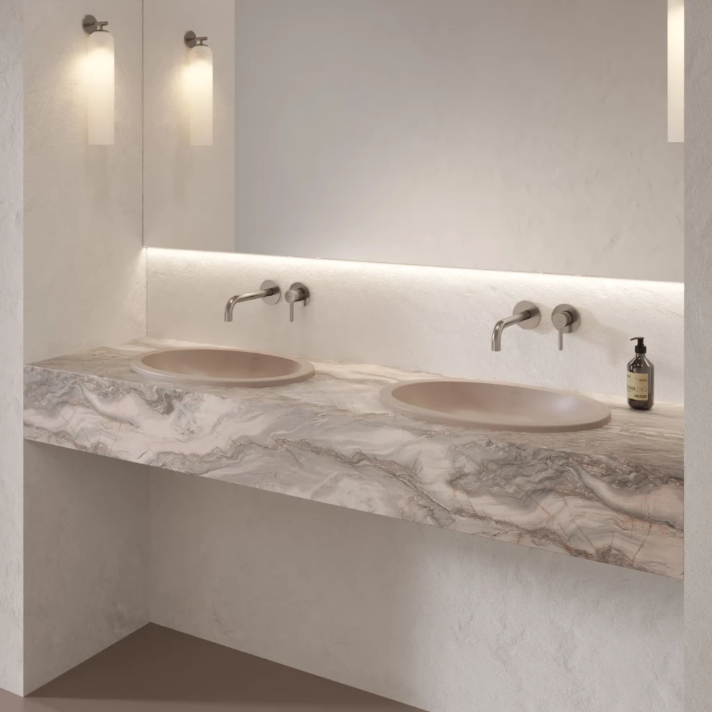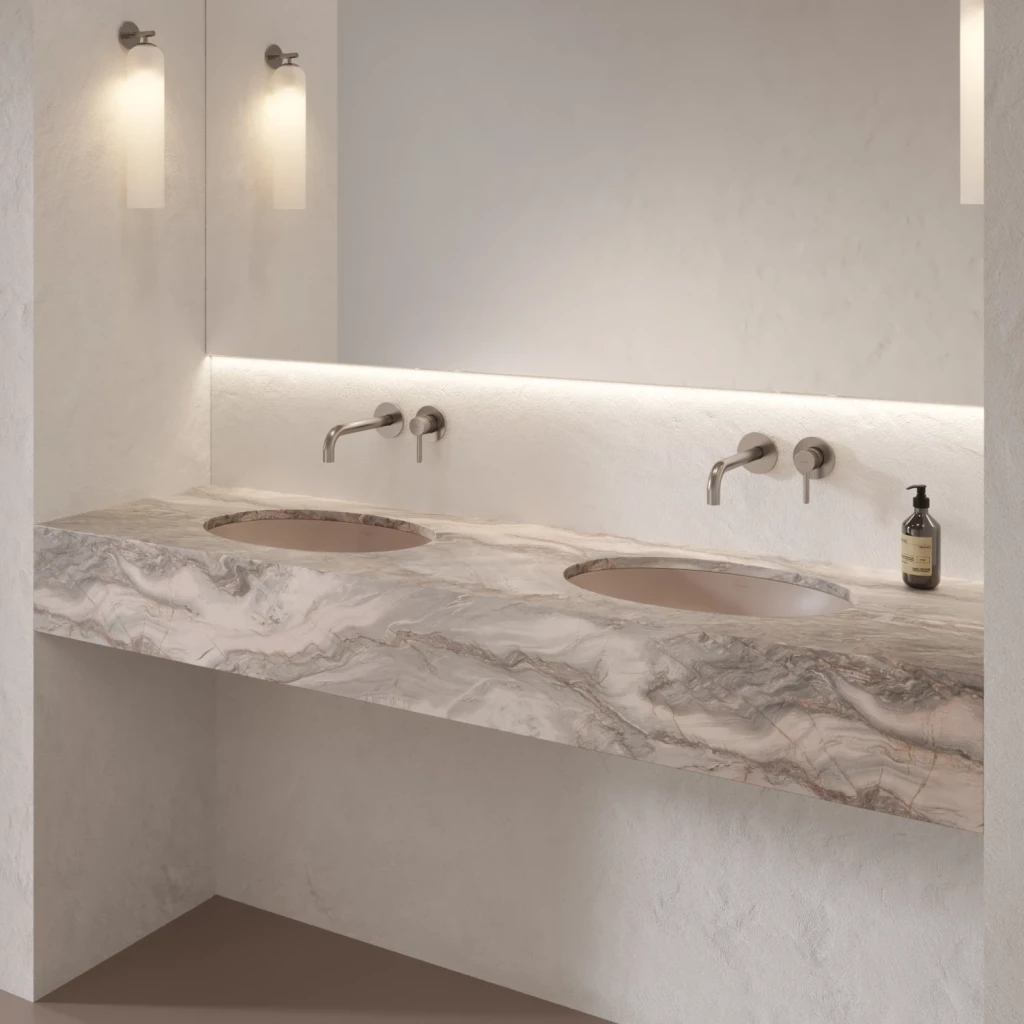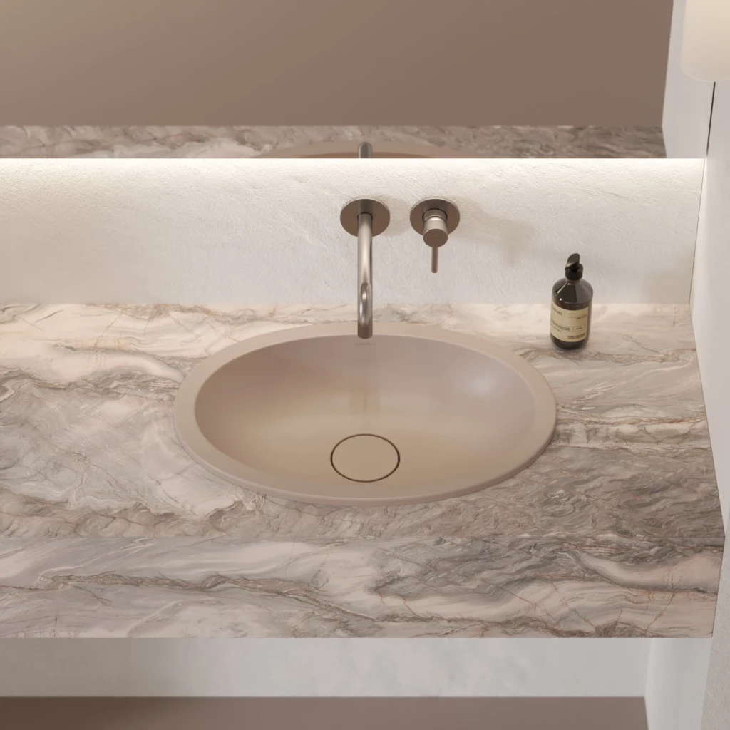 Umývadlo pod dosku z kolekcie OMNIRES SHELL M+ sa vyznačuje moderným eliptickým tvarom, ktorý sa zužuje k mäkkému dnu. Jeho optimálne rozmery sú ideálne pre kúpeľne s jedným aj dvoma umývadlami. Precízne navrhnutý okraj umožňuje inštaláciu pod dosku a vytvára tak bezšvový a súdržný povrch. Umývadlo je možné tiež zapustiť do pracovnej dosky, takže zostane viditeľný iba minimalistický okraj. Obe montážne riešenia nielen uľahčujú každodennú údržbu, ale taktiež optimalizujú využitie priestoru, vďaka čomu je umývadlo ideálnou voľbou pre moderné a minimalistické interiéry.