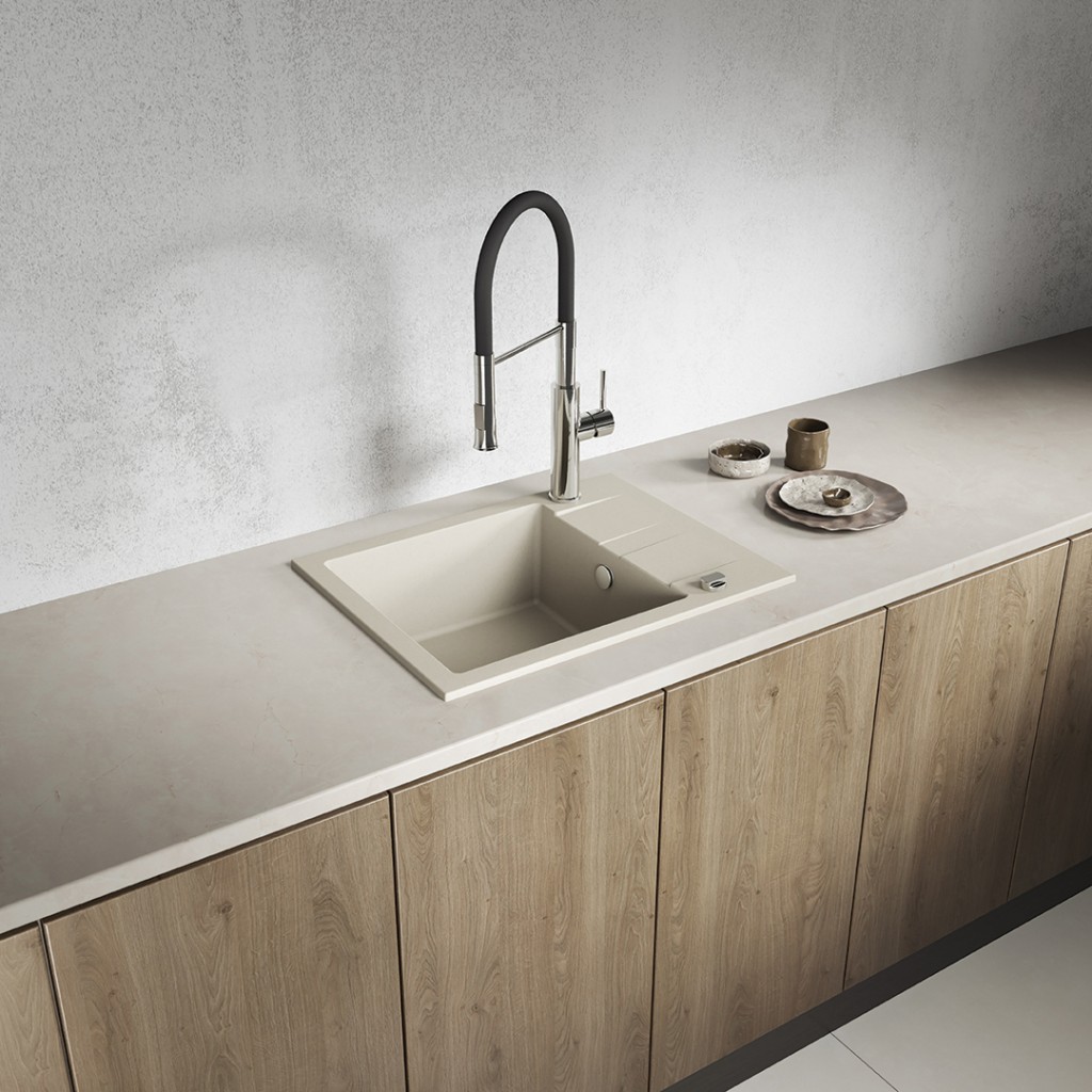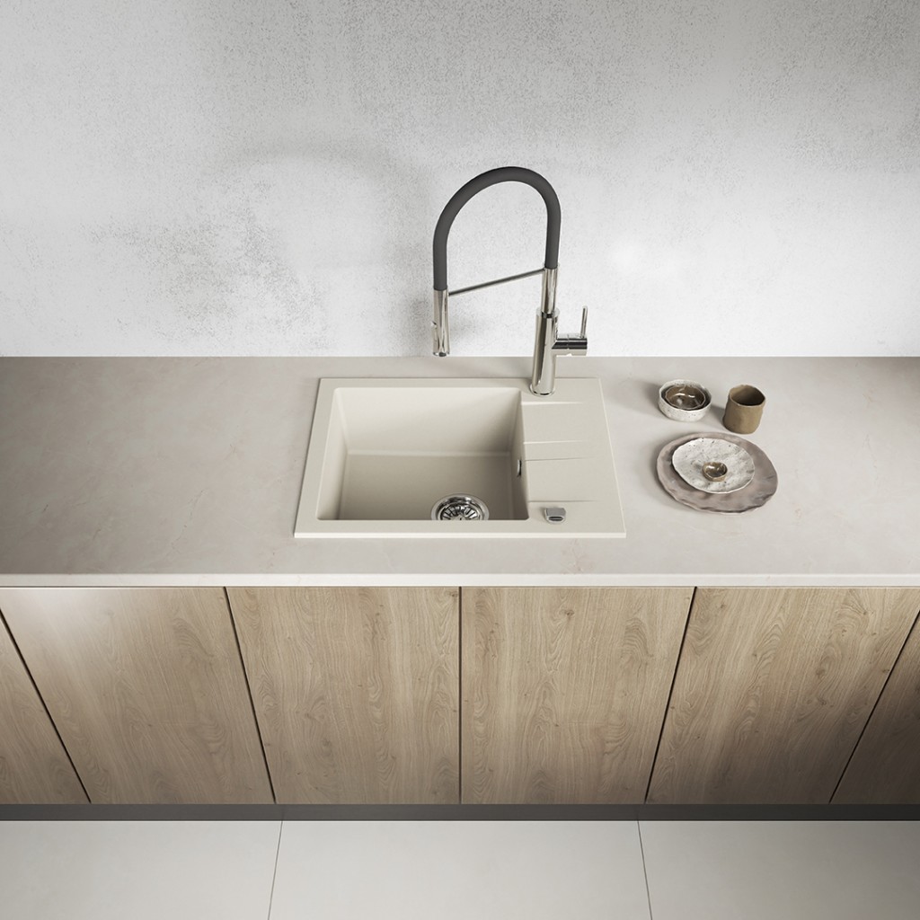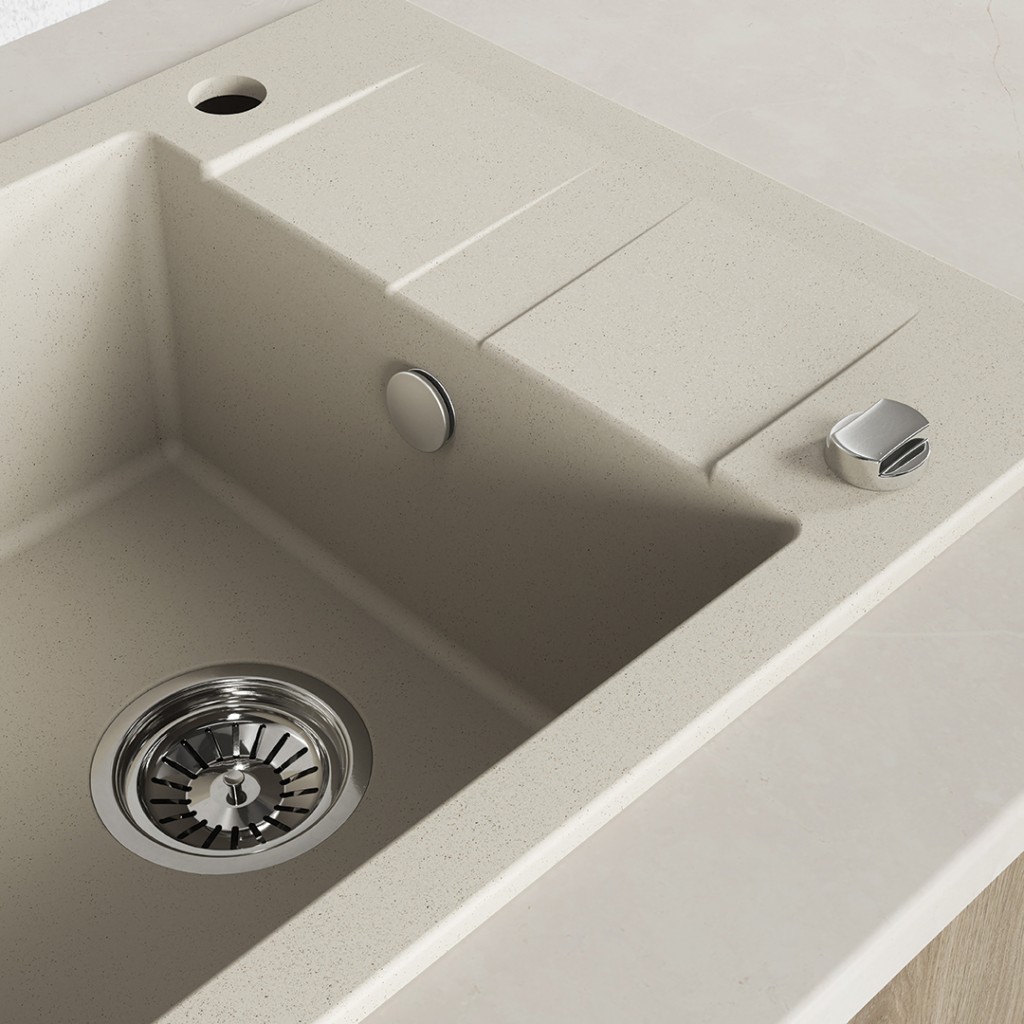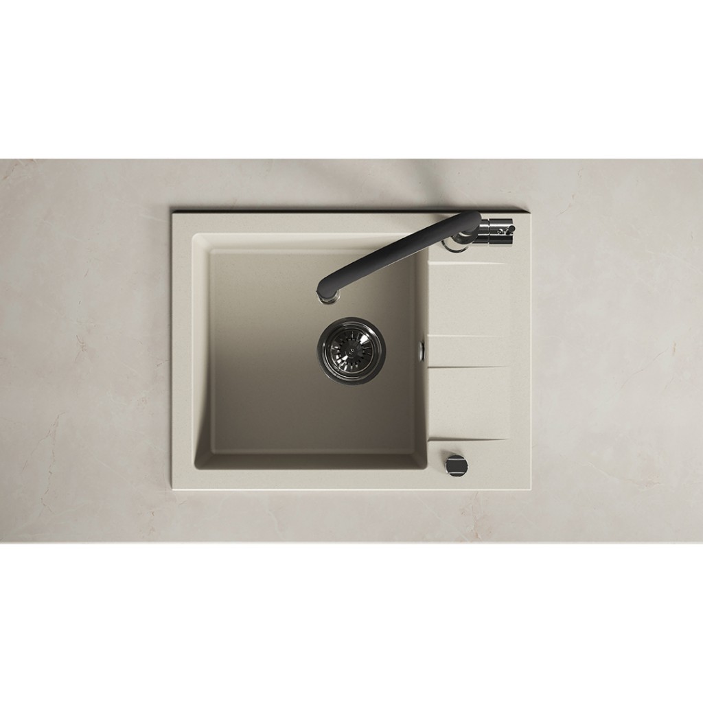 Béžový jednodrez SHIRE z granitu s odtokom je elegantným a praktickým riešením, ktoré sa hodí do malých aj väčších kuchýň. Jeho univerzálny odtieň dokonale doplní škandinávsky, boho, klasický aj moderný interiér. Vďaka kompaktným rozmerom (440 x 570 mm) a možnosti obojstrannej montáže umožňuje SHIRE jednoduché prispôsobenie usporiadaniu vašej pracovnej dosky, zatiaľ čo hlboká misa (170 mm) a funkčný odtok zaisťujú pohodlie pri každodennom používaní. Drez je vyrobený z odolnej granitu, je odolný voči poškriabaniu, zmene farby, nárazom a teplotám až do 250 °C. Je vybavený prepadom, otvorom pre batériu a sifónom šetriacim miesto v skrinke pod drezom. Je vynikajúcou voľbou pre tých, ktorí si cení estetiky, kvality a jednoduchej inštalácie.