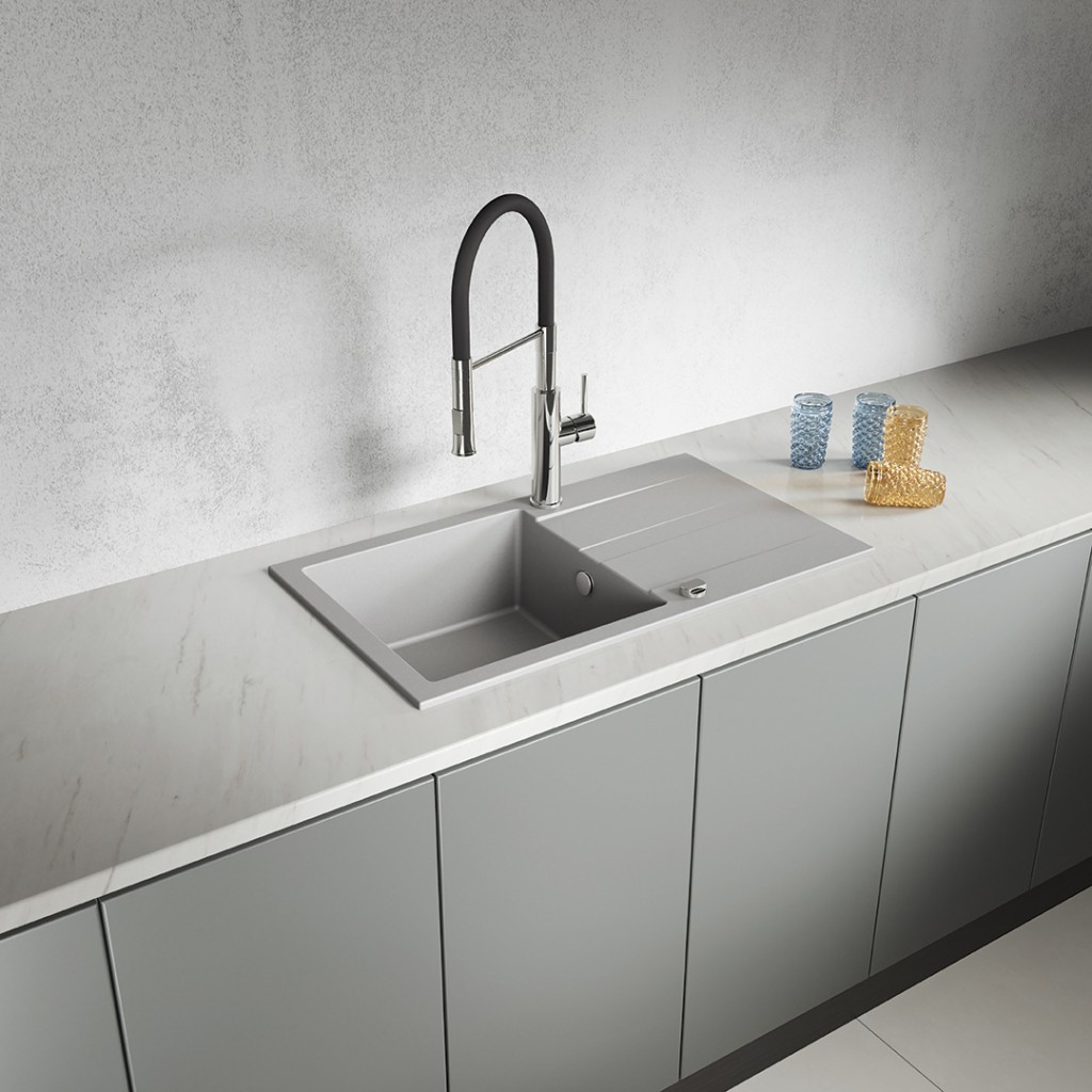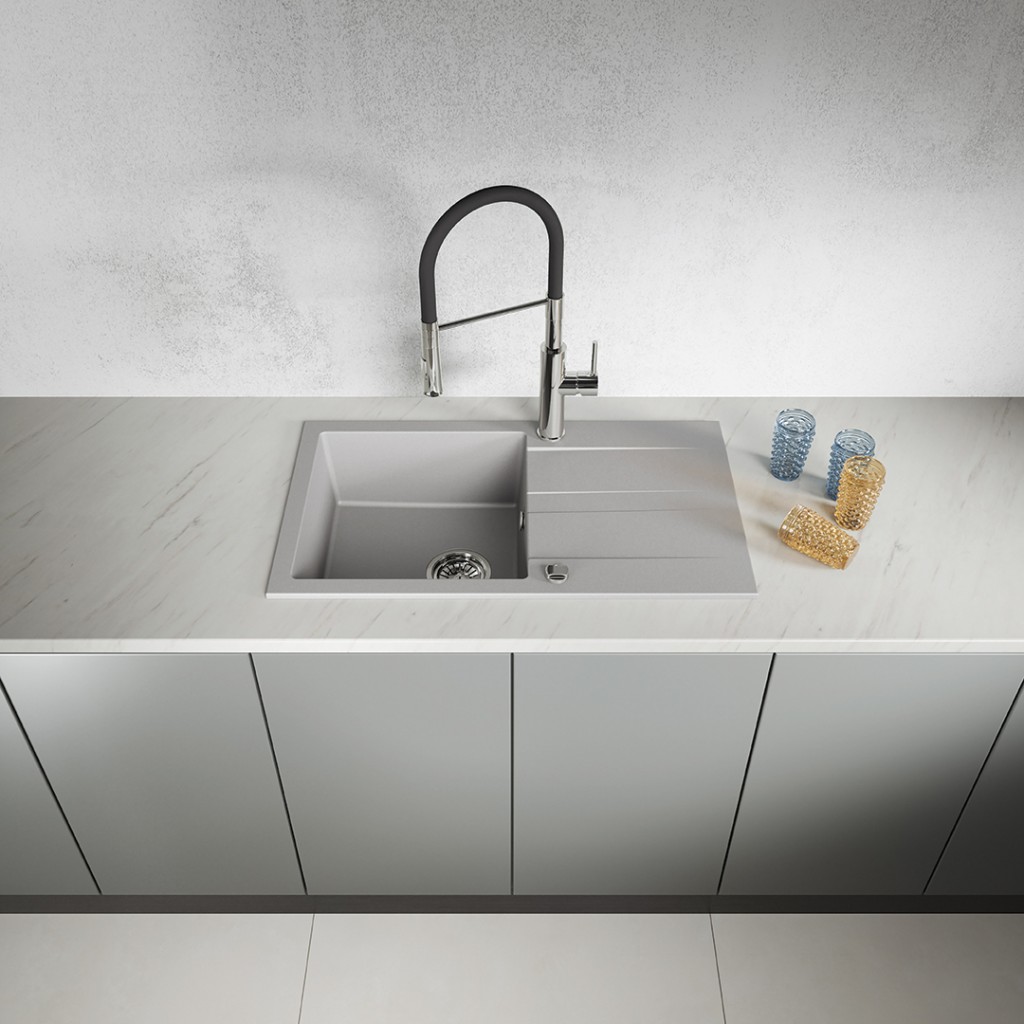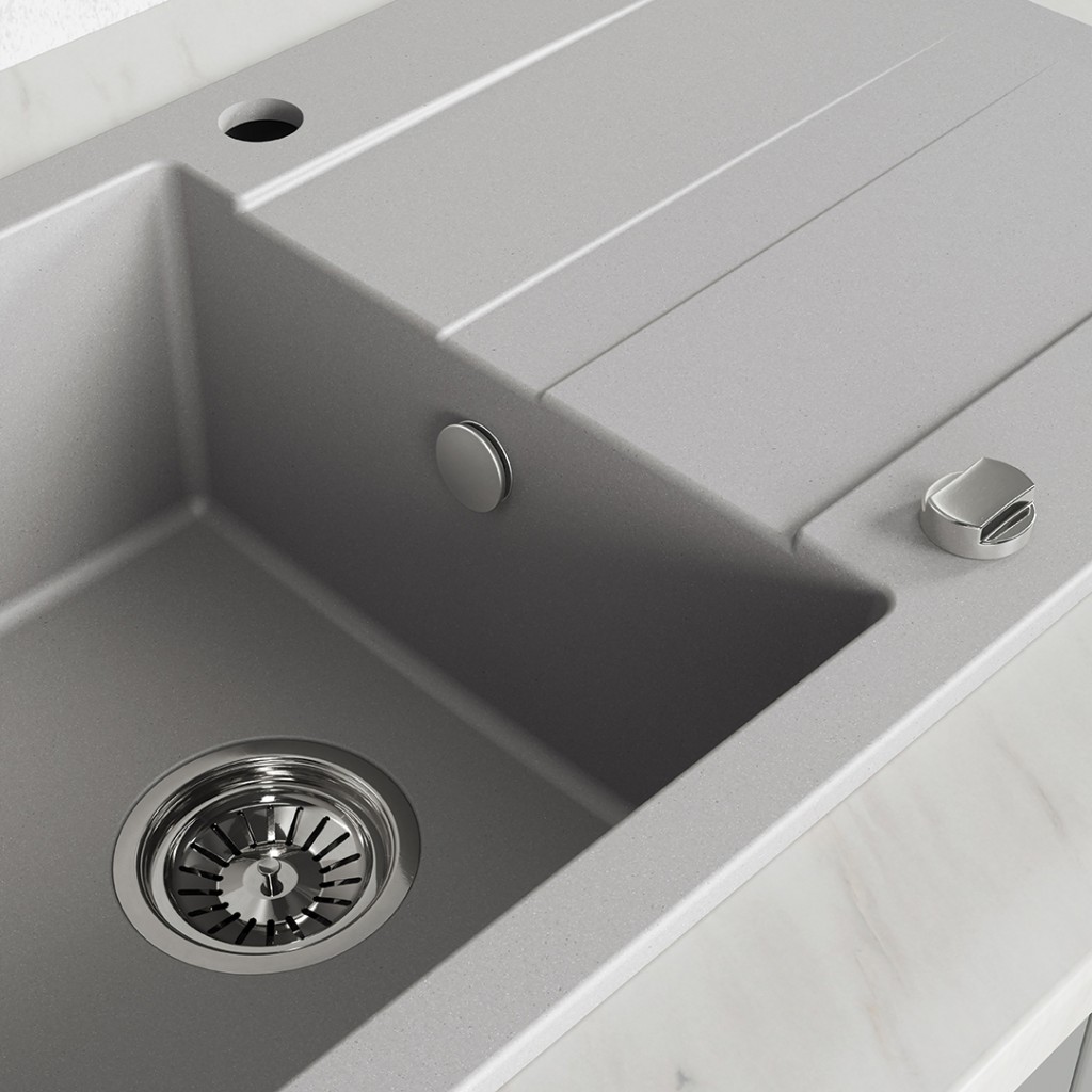 Šedý jednodrez SHIRE zo žuly s plnohodnotným odtokom je klasickou voľbou pre tých, ktorí si cenia eleganciu, pohodlie a spoľahlivosť. Vďaka svojim veľkorysým rozmerom (760 x 440 mm), priestrannej mise (hĺbka 170 mm) a praktickému odtoku s reliéfnymi okrajmi smerujúcim k odtoku je model SHIRE ideálny ako pre veľké kuchyne, tak pre menšie kuchyne bez umývačky riadu a ponúka pohodlné podmienky na umývanie a sušenie riadu. Drez sa inštaluje v jednej rovine s pracovnou doskou a je dodávaný s predvŕtaným otvorom pre batériu. Obojstranný dizajn umožňuje inštaláciu s odtokom vľavo alebo vpravo, čo vám umožní prispôsobiť si usporiadanie individuálnym potrebám. Súprava obsahuje sifón SpaceSaving, ktorý vedie odtok pozdĺž steny a šetrí tak cenné miesto v skrinkách – takže do neho môžete ľahko namontovať aj systém triedenia odpadu. SHIRE je vyrobený z odolnej žuly, ktorá je vytvorená z kombinácie prírodných kamenív a živíc, vďaka čomu je drez odolný voči nárazom, poškriabaniu, zmene farby a vysokým teplotám. Jeho hladký povrch uľahčuje čistenie a jeho univerzálna šedá farba dopĺňa klasické aj moderné interiéry. SHIRE, dostupná aj v čiernej a béžovej farbe, je spoľahlivým kuchynským riešením, ktoré vám vydrží roky.