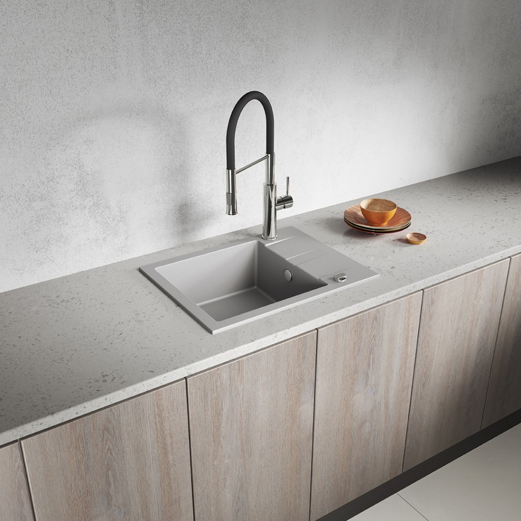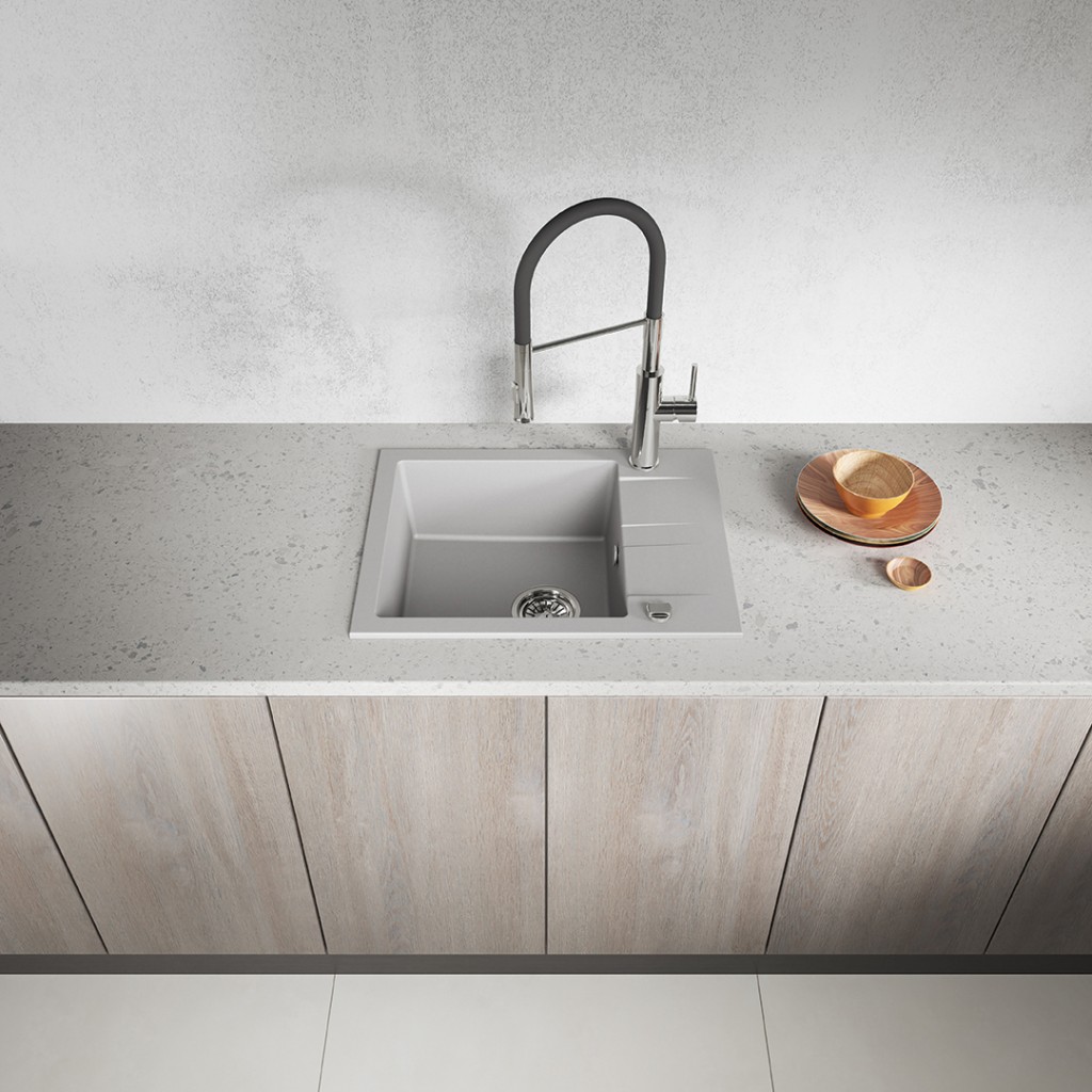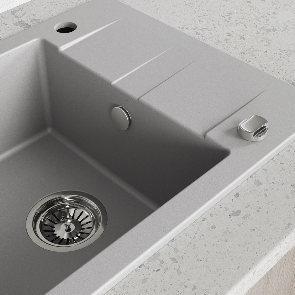 Žulový drez SHIRE je štýlovým a funkčným riešením pre každú kuchyňu. Je vyrobený z odolnej žuly, ktorá je odolná voči poškriabaniu, nárazom, zmene farby a vysokým teplotám (až do 250 °C). Vďaka inštalácii v jednej rovine s pracovnou doskou uľahčuje čistenie a dodáva kuchyni elegantný vzhľad. Šedá farba drezu sa bez problémov hodí do svetlého aj tmavého interiéru a jeho kompaktné rozmery ho robia ideálnym pre malé kuchyne a skrinky so šírkou 50 cm. Model SHIRE je vybavený prepadom, otvorom pre batériu, ručným odtokom, výpustom umývačky a priestorovo úsporným sifónom, ktorý šetrí miesto v skrinkách. Toto premyslené riešenie kombinuje estetiku s každodenným pohodlím.