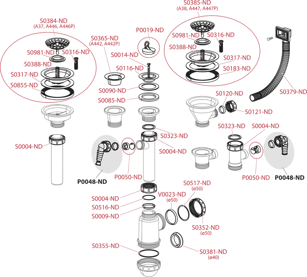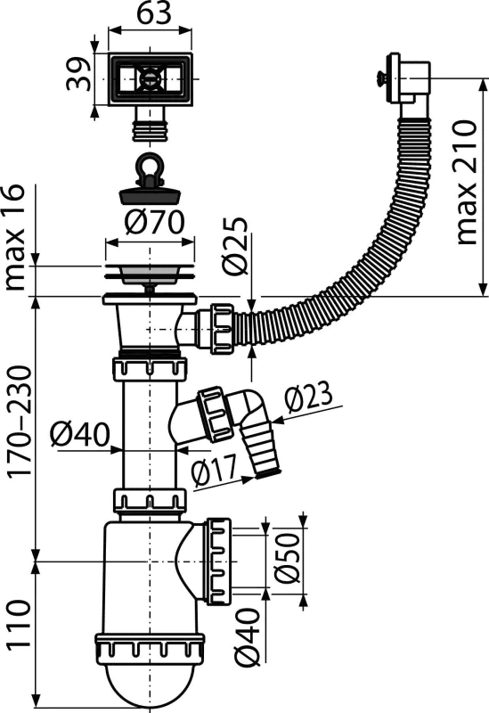 vývod odpadu pripravený pre napojenie odpadovej trubky - priemer 50 alebo 40 mm
