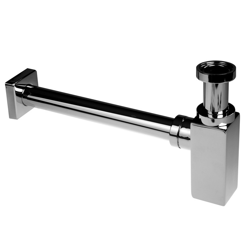 Celokovový chrómovaný sifón s prevlečnou maticou v hranatom dizajne.