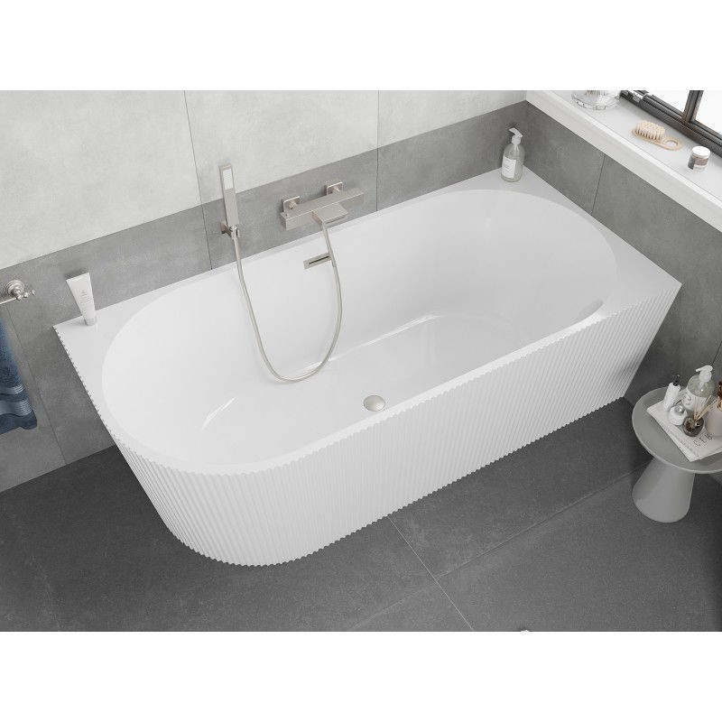Špecifikácia produktu: Rozmer: 150 x 75 cm Výška: 58 cm Hĺbka: 42,5 cm Montáž: Rohová, Ľavá Materiál: Sanitárny akrylát Farba: Biela Povrchová úprava: Kartáčovaný nikel Štruktúra: Drážkovaná Otvor pre prepad: Áno Otvor pre batériu: Nie Sifón a záter batériu a UV žiarenie