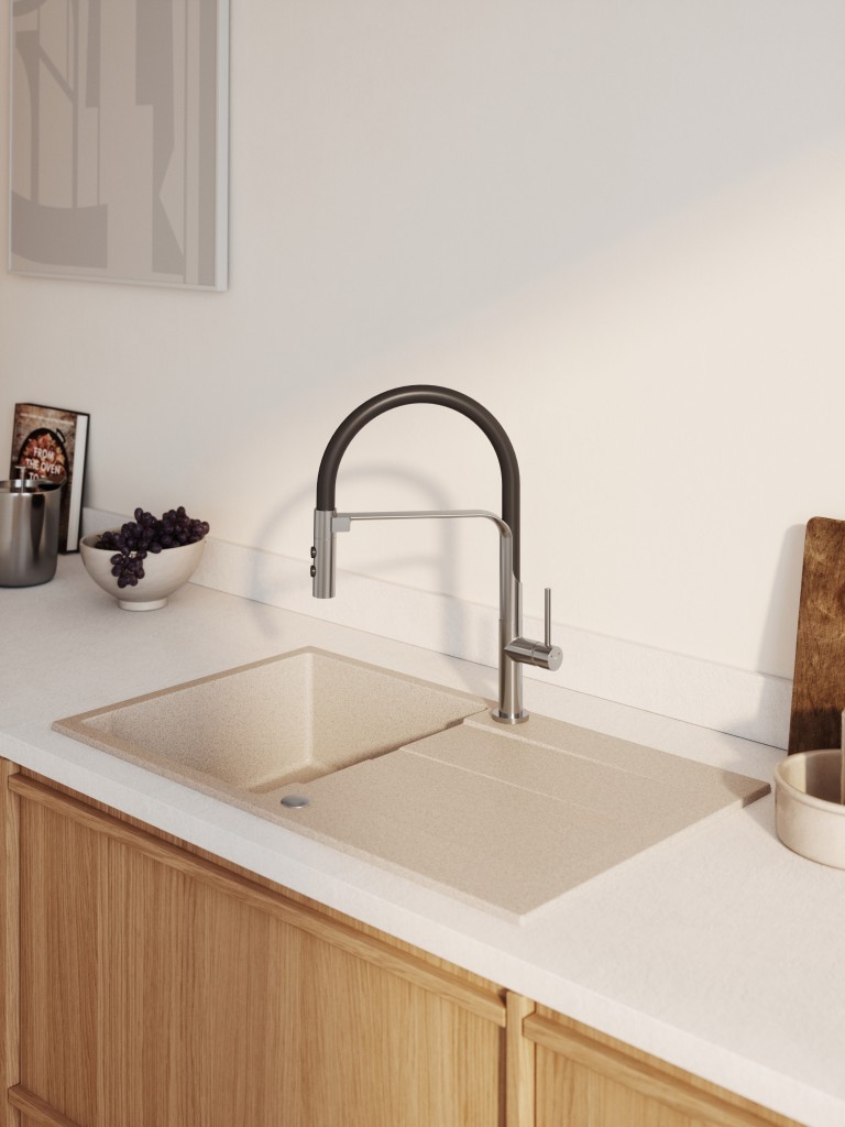 Kuchynské batérie Siluetto predstavujú ideálne spojenie štýlu, inovácie a praktickosti. Dostupné v troch moderných farebných prevedeniach – chróm/ čierna, grafit/ čierna a čierna – umožňujú ľahko zladiť batériu s akýmkoľvek kuchynským interiérom.