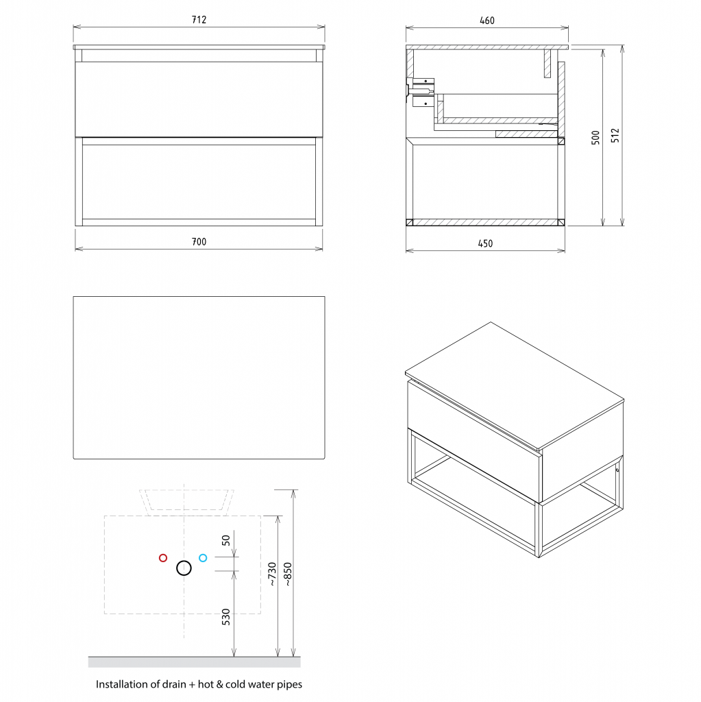 Závesné konštrukcie v šírkach 60, 80 a 100 cm sú určené pre umývadlo TWIG z liateho mramoru v bielej farbe. V ponuke sú aj konštrukcie určené výhradne na inštaláciu s rockstone doskou v šírkach 70 až 100 cm.