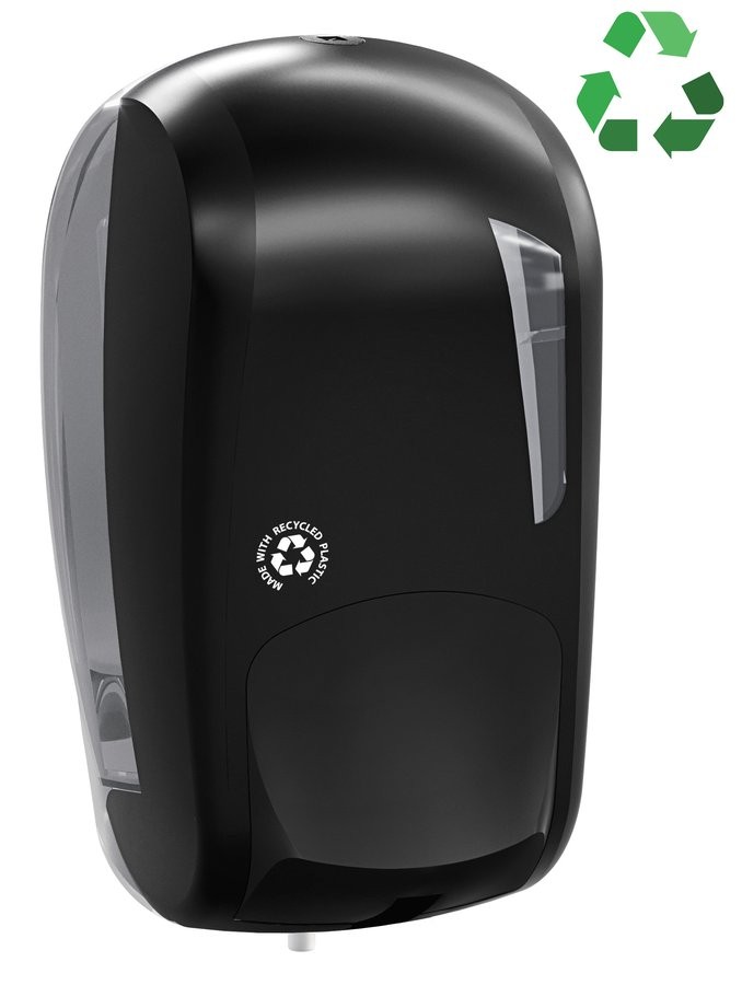 Okénko pro kontrolu objemu mýdla Kolekce SKIN pro veřejné prostory zahrnuje kompletní výběr koupelnových doplňků, které se vyznačují moderním designem. Doplňky v barevném provedení černá a písková jsou vyrobeny z recyklovaného plastu. (celý popis)