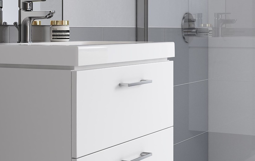 Závesná skrinka LARA v bielom lesklom prevedení s dvoma šuplíkmi so systémom mäkkého dovierania, je doplnená chrómovými madlami. Skrinka je možné kombinovať s umývadlami COLOUR, MODUO, CITY, COMO.