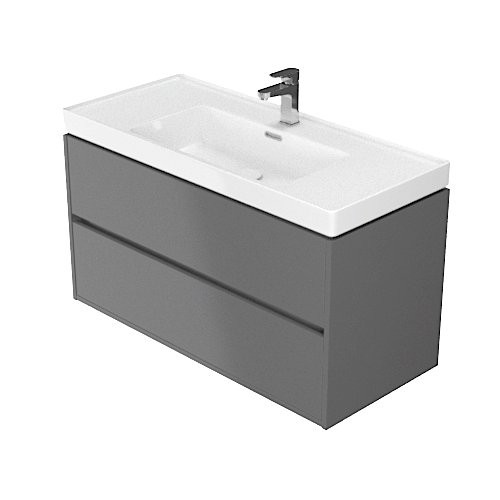 Závesná umývadlová skrinka CREA 100 s dvoma výsuvnými boxmi v šedom matnom prevedení a elegantným šedým ľanovým vnútrom. Vyrobená je z drevotrieskových dosiek s modernou technológiou AQUASAFE /zvýšená odolnosť proti vlhkosti/. Skrinka pôsobí elegantným vzhľadom vďaka zapusteniu prednej časti a využitiu skrytých madiel. Zásuvky sú vybavené pojazdmi "HAFELE" s plným výsuvom a tichým uzatváracím systémom, ktorý zvyšuje komfort používania. Skrinka je možné kombinovať s umývadlami CREA a COMO.