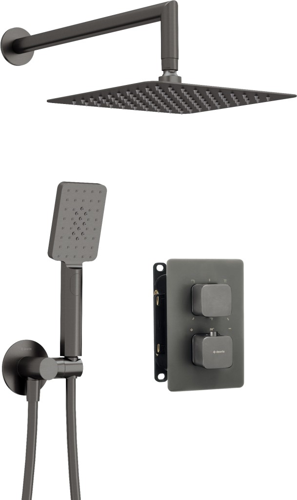 Táto podomietková sprchová sada kombinuje modernú technológiu s nadčasovou estetikou. Obsahuje presný termostatický batériový batériový systém, obdĺžnikovú sprchovú hlavicu a ručnú sprchu s príjemným dažďovým prúdom vybavenú systémom Anti-Calc, ktorý účinne znižuje usadzovanie vodného kameňa. Výberom kompletnej sady si môžete byť istí, že všetky komponenty do seba dokonale zapadajú a vytvárajú ucelený celok. Podomietková inštalácia zaručuje maximálny minimalizmus a vizuálny poriadok v sprchovom priestore, zatiaľ čo titánová povrchová úprava dopĺňa klasický aj moderný interiér. Toto riešenie kombinuje funkčnosť, pohodlie a estetiku na najvyššej úrovni.
