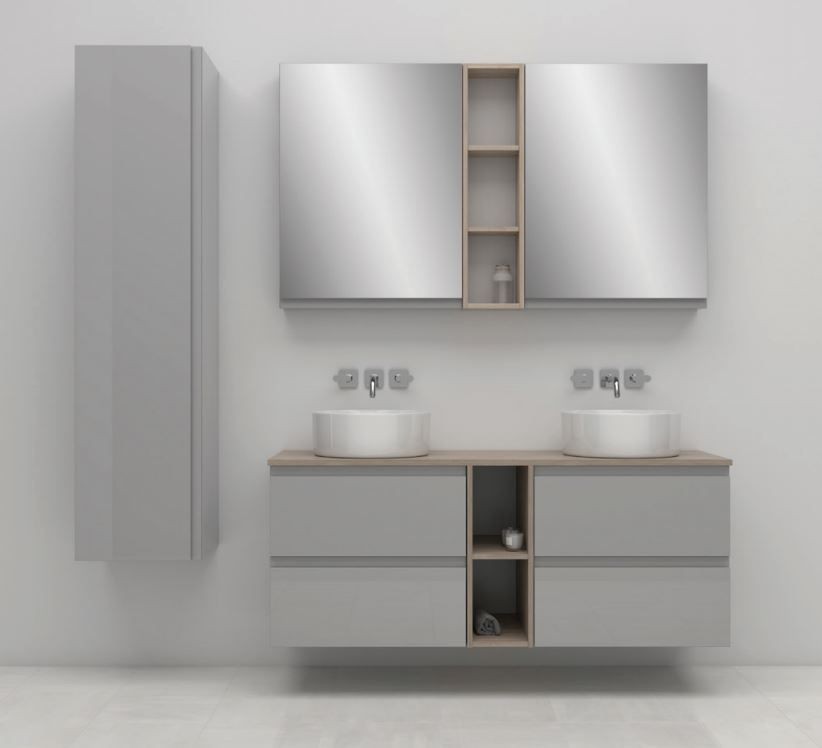 Závesný nábytkový stĺpik v šedom lesklom prevedení pre ukladanie kúpeľňových doplnkov. Elegantná nábytkový stĺpik má vyfrézovaný úchyt po celej dĺžke, dvierka má opatrená pánty s tichým dovieraním, vďaka ktorým je možné dvere otvoriť o 165 ° a možno tak pohodlne využiť zrkadla umiestneného po celej ploche vnútornej časti dvierok.