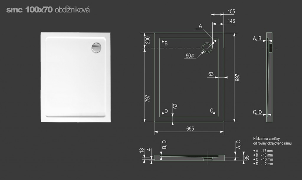 - výška vaničky obyčajné 3,5cm pre čistý dizajn vo Vašej kúpeľni pri umiestnení na podlahu