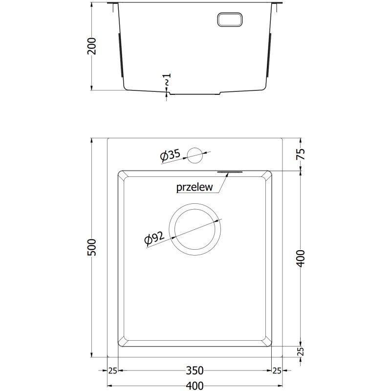 Špecifikácia produktu: Rozmer: 400x500x200 mm Hĺbka drezu: 200 mm Rozmery drezu: 400x350 mm Hrúbka oceľového hrán: 3 mm Hrúbka oceľového hrán drezu: 1 mm Polomer zaoblenia rohov drezu: R10 Priemer odtoku: ø Nerezová oceľ AISI 304 Farba: Čierna Povrch: Hladký Povrchová úprava sifónu: Čierna Otvor pre prepad: Áno Otvor pre batériu: Áno Ručný sifón s odpadkovým košom a zátkou Prídavný kryt odtoku Skrytý otvor pre prepad Zvukovo izolačné rohože k drezu Odolnosť teplotám a tepelným šokom Povrch pre ľahké čistenie