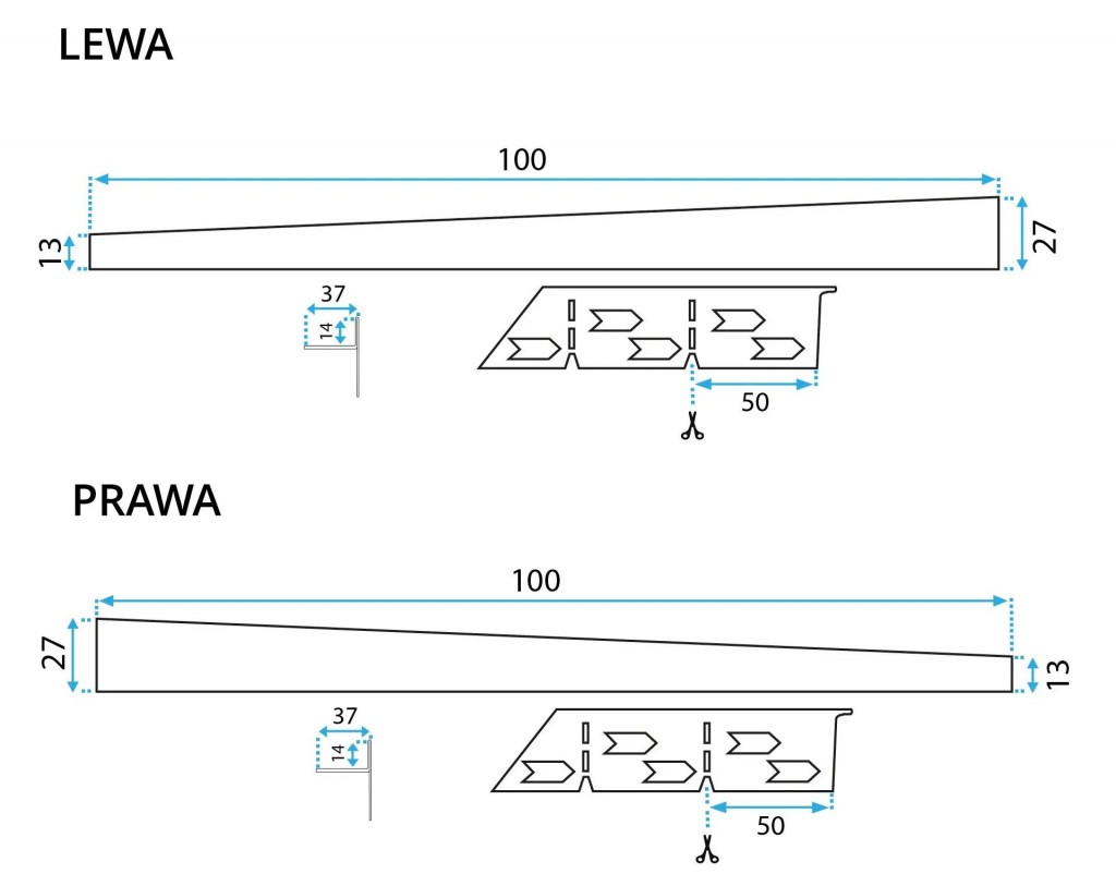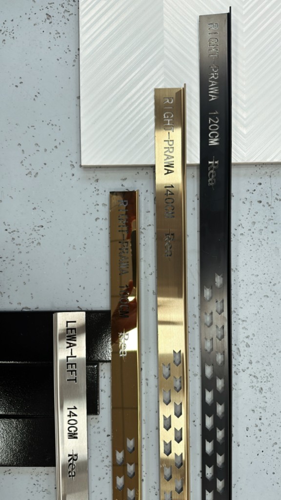 Spádové lišty sú dostupné v pravom alebo ľavom prevedení . Aké prevedenie potrebujete spoznáte pokiaľ stojíte pri sprchovacom kúte a pozeráte sa v smere spádu ku kanáliku, tak ak potrebujete profil na ľavú stranu, je to ľavý, ak na pravú stranu, je to pravý.