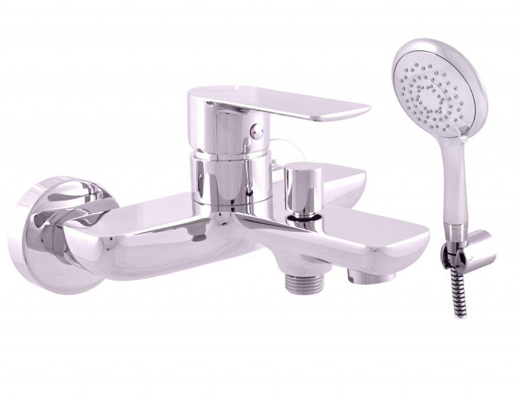 Sporiaca vodovodná batéria vaňová nástenná so sprchou a pevným držiakom.