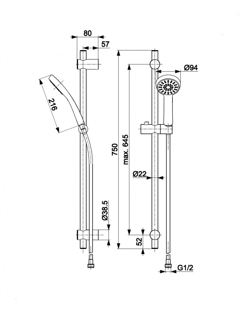 - jedno funkčné ručné sprcha s držiakom na lište je možné presunúť nahor alebo nadol a zafixovať v požadovanej polohe