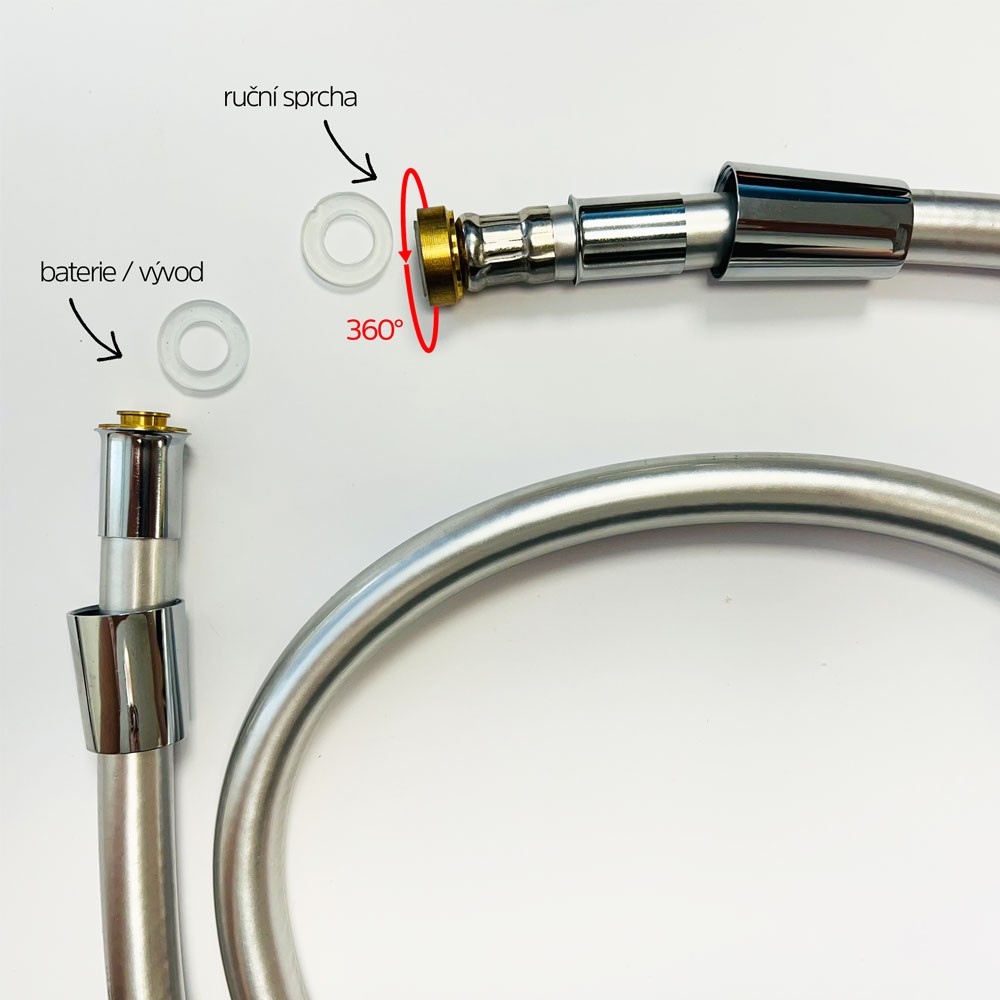 - Anti-twist: systém proti prekrúteniu hadice - umiestnený na strane s dlhším kónusom, montuje sa na ručnú sprchu