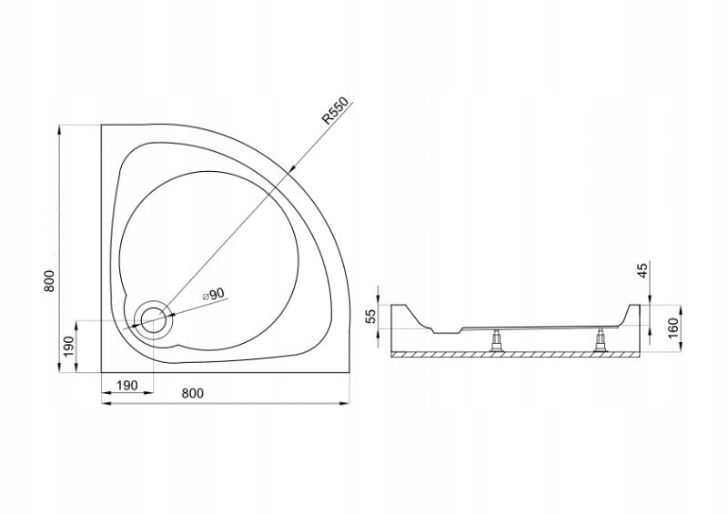 Sprchový kút je dodávaný s akrylátovou sprchovou vaničkou v bielej farbe s rozmermi 80 × 80 cm a výškou 16 cm. Vanička je vybavená montážnymi nožičkami pre jednoduchú inštaláciu. Sifón nie je súčasťou balenia – je nutné ho dokúpiť samostatne. Pre túto vaničku je vhodný sifóns priemerom odtoku 90 mm .