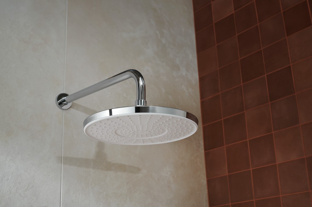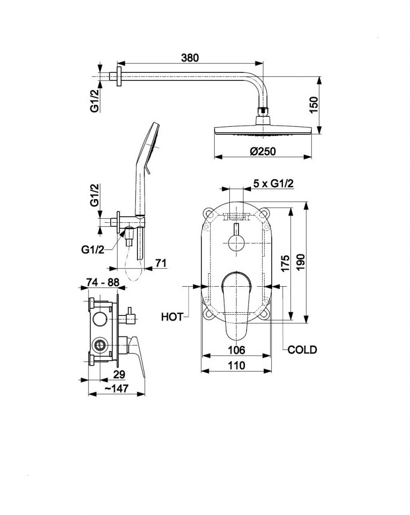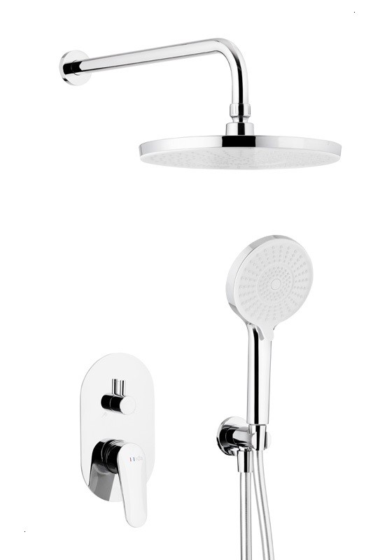 Mosadzná podomietková batéria je vybavená keramickou kartušou, kde sa mieša teplá a studená voda. Výhodou keramickej kartuše je dlhá životnosť a nižšie opotrebenie používaním. Hlavová sprcha má priemer 250 mm a je opatrená gumovými tryskami, ktoré zabarňujú usadzovanie vodného kameňa. Hlavová sprcha je namontovaná pomocou sprchového ramena s dĺžkou 380 mm, ktoré je prispôsobené montáži na stenu so štandardným pripojením G 1/2". Celý set je opatrený povrchovou úpravou, kedy je povrch odolný proti korózii a poškriabaniu. V sete samozrejme nechýba plastová ručná sprcha s tromi funkciami, pripojením G1/2", uhlovým vyústením s držiakom a PVC hadicou dlhé 1500 mm.