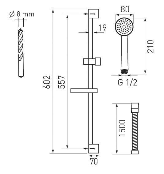 Súprava obsahuje 5-polohovú sprchovú ružicu, posuvný držiak sprchy dĺžky 600mm, kovovú hadicu 150 cm a plastovú mydelničku. Balené v blistroch. Priemer tyče 19 mm 5 mm. />