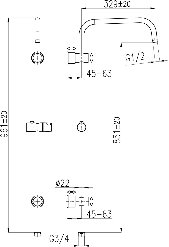 Sprchová tyč na batériu s hlavovou a ručnou sprchou.