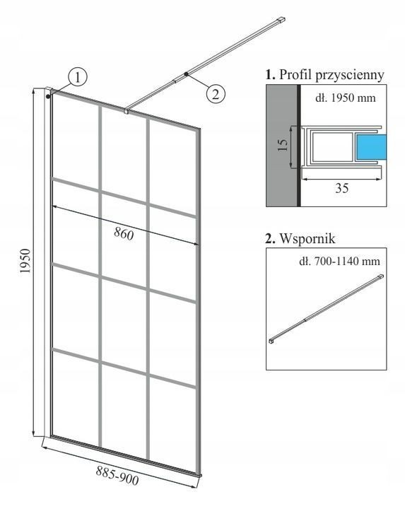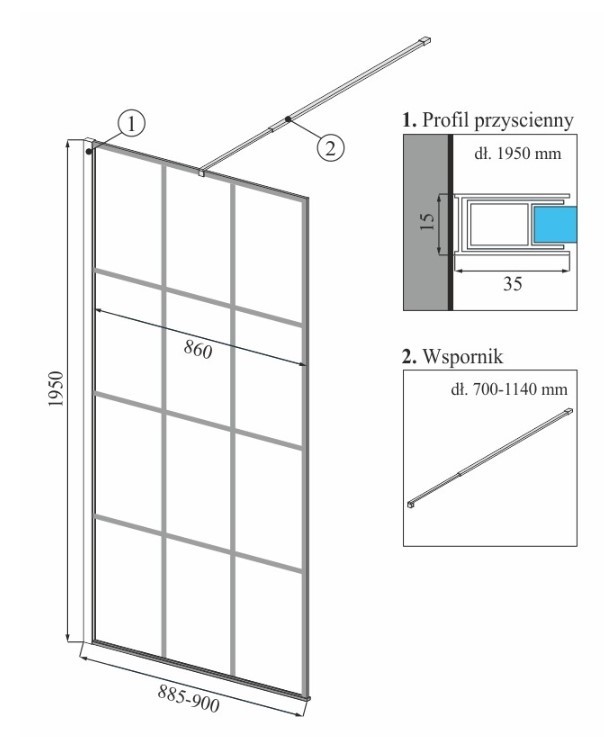 Šírka zásteny sa dá pomocou hliníkových profilov ľahko regulovať a prispôsobiť tak krivým stenám. Rozsah šírky je od 88,5 do 90 cm.