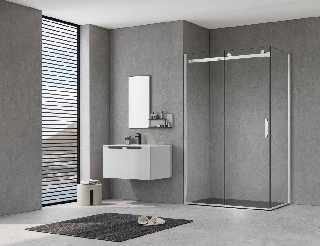 Luxusné sklenené posuvné dvere do niky. Plynulý a komfortný pohyb dverí zaisťujú horné masívne bezúdržbové ložiskové kolesá a spodný vodiaci diel. Vďaka absencii spodného vodiaceho profilu, vzniká ideálny bezbariérový vstup do sprchy. Tieto dvere sú vyrobené zo skiel o sile 8 mm. Dodáva sa v univerzálnom pravom aj ľavom prevedení.