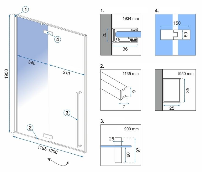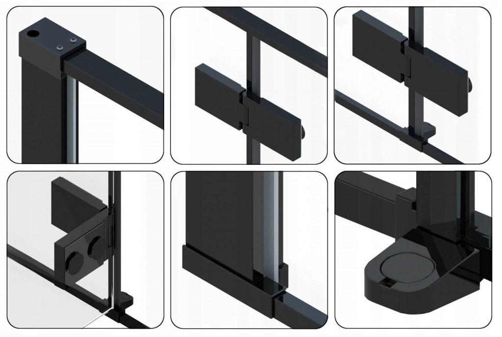 V čiernych hliníkových rámoch s matnou povrchovou úpravou je zasadené tvrdené sklo s hrúbkou 6 mm . Je opatrené nano vrstvou EASY-CLEAN, ktorá uľahčuje stekanie kvapiek, čím na povrchu nevznikajú škvrny od zaschnutej vody. Aj napriek tomu odporúčame používať stierku na sklo .