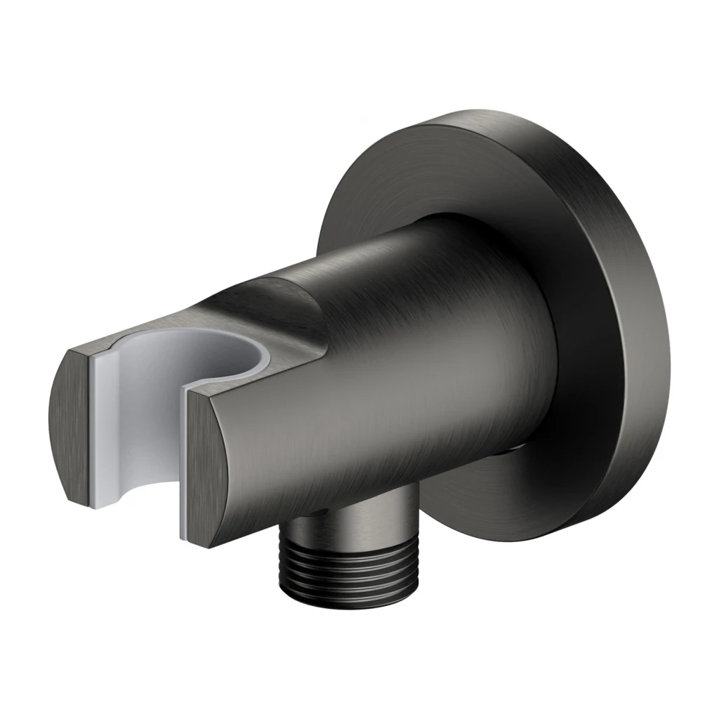 Mosadzný držiak ručnej sprchy s vyústením pre podomietkovú montáž okrúhleho tvaru.