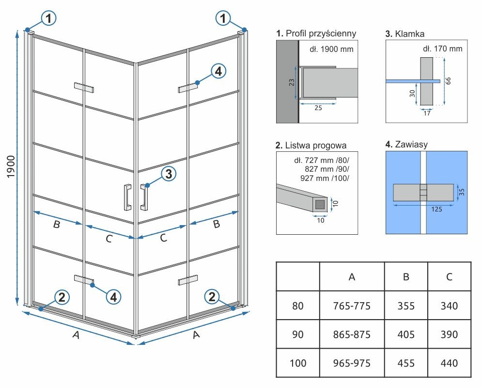 Exkluzívny model skladacieho sprchovacieho kúta Rea Molier je vyrobený z vysoko kvalitného bezpečnostného skla s povrchovou úpravou CrystalClear as laserom nanášaným povrchom EasyClean . Aj napriek tomu ale odporúčame používať stierku na sklo . Obliečka sprchových dverí bola nanesená na obe dve strany, takže je možné dvere namontovať vpravo aj vľavo. Je vybavený hliníkovými profilmi s hrúbkou 23 mm. Praktické mosadzné úchyty umiestnené v optimálnej výške pre užívateľov umožňujú pohodlné otváranie a zatváranie dverí.